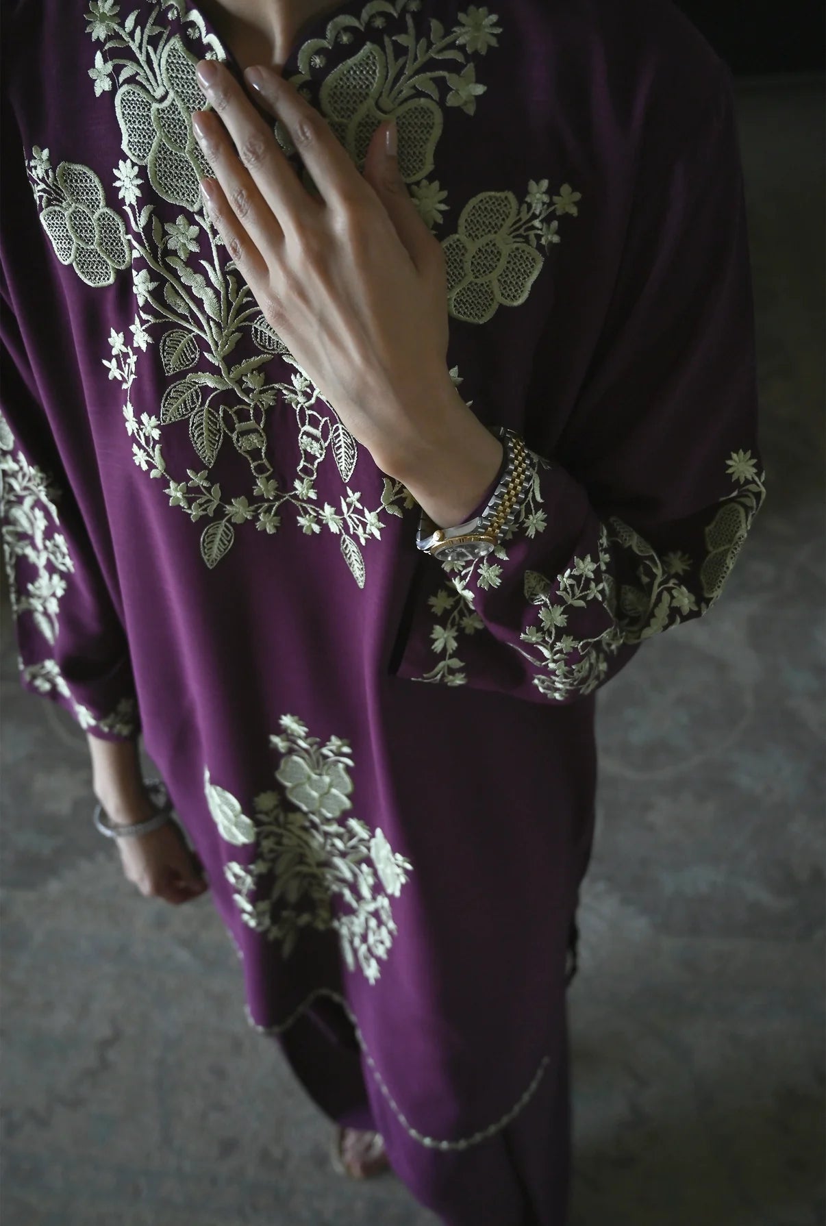 This 2-piece set in burgundy comes in breathable soft linen that is perfect for a relaxed, everyday look. The shirt features a simple notched neckline and a straight, comfortable fit that is easy to style. The front & sleeves have beautifully embroidered floral patterns, giving the outfit a bold, artistic feel. Paired with matching trousers, this set is a perfect example of effortless casual wear that feels unique and thoughtfully designed.