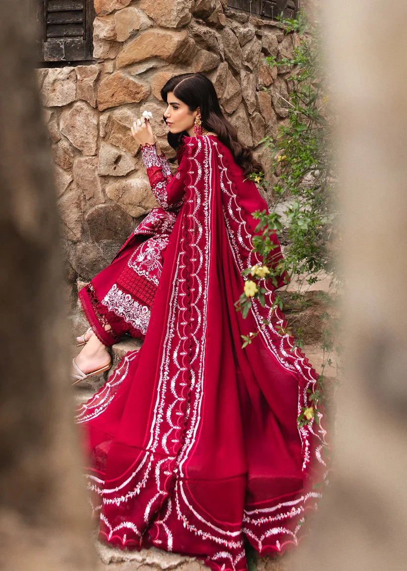 Add elegance and charm to your summer wardrobe with this beautiful 3-piece rich maroon outfit. Perfectly tailored for refined summer style. The open shirt showcases a beautiful blend of pink and blue embroidery on the jacquard lawn panels, creating a soft yet striking contrast against the deep maroon hue. The shirt's delicate lace detailing adds a touch of femininity, while the embroidered sleeves with fine stitching and lace work exude a sense of sophistication and refinement. Paired with matching culottes featuring intricate embroidery and stitching, this outfit offers a perfect blend of style and comfort. The ensemble is beautifully complemented by a coordinating maroon chiffon dupatta, adorned with a four-sided embroidered border and lace finishing, adding a light, airy texture and a polished finish to the overall look.