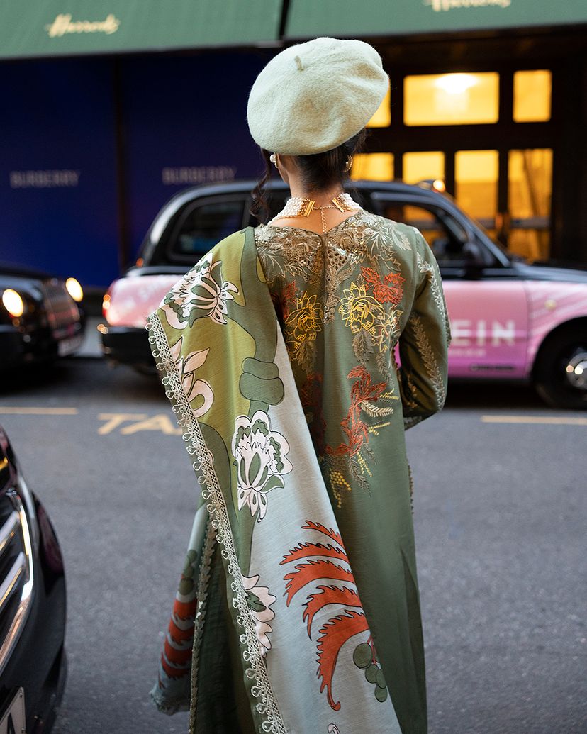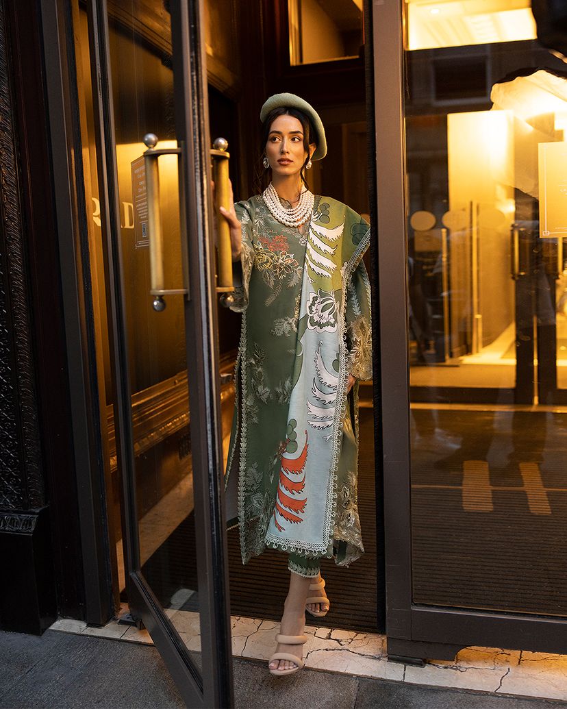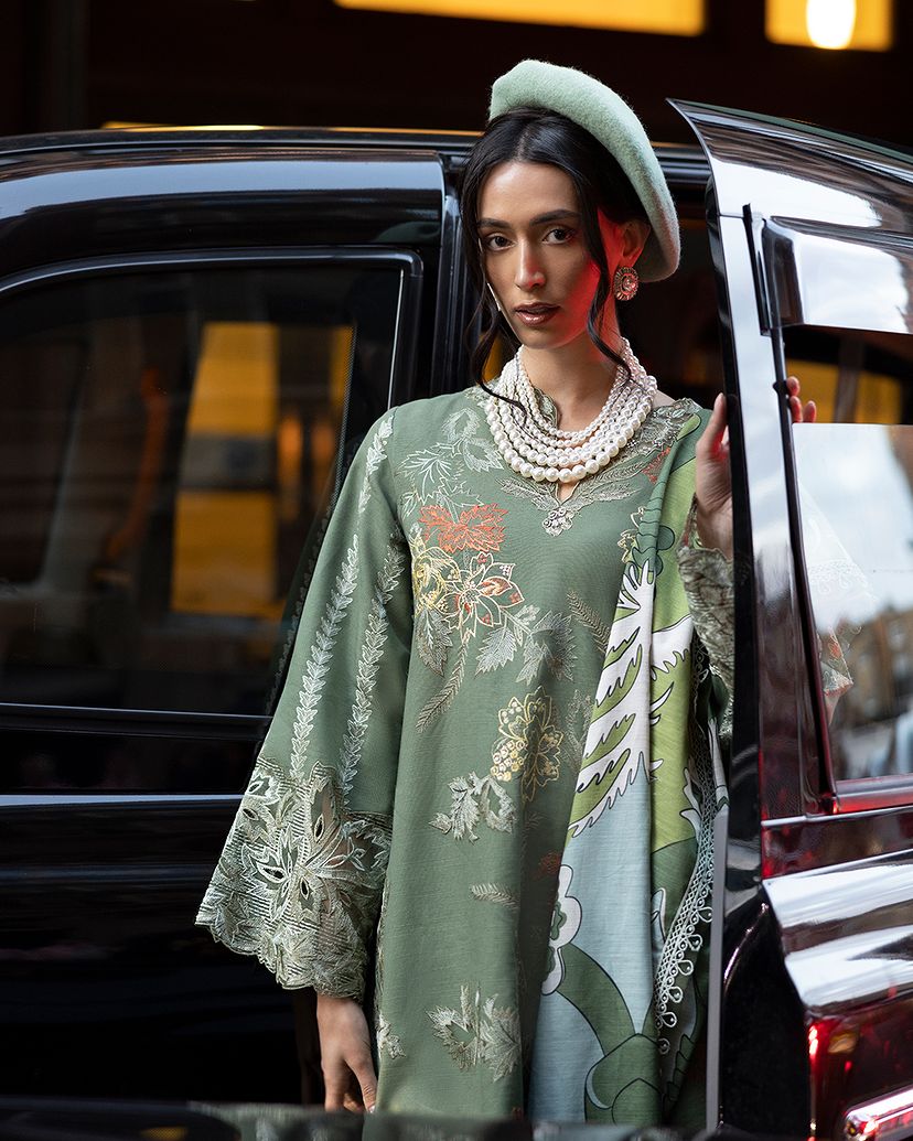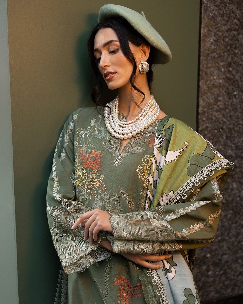 "Chelsea Charm" ensemble offers a harmonious blend of elegance. The sequin embroidered khaddar shirt, adorned with intricate embroidery on the sleeves, exudes sophistication and grace. The embroidered sleeves add a touch of timeless charm, while the printed khaddar shawl, featuring delicate crochet lace finishing’s, completes the ensemble with a touch of ethereal beauty.