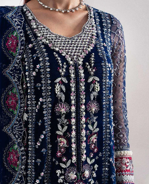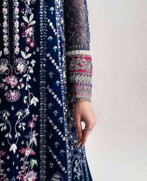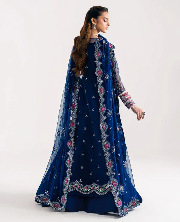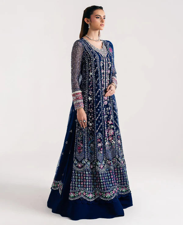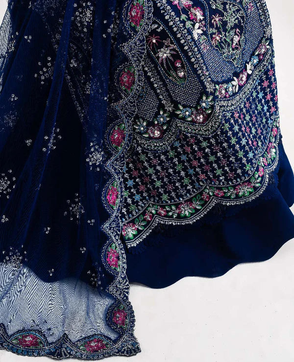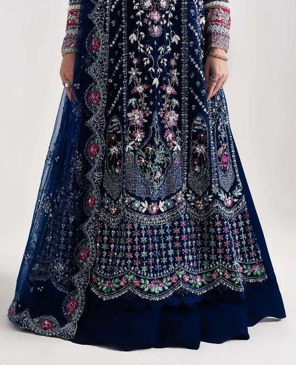 This elegant 7-panel blue net shirt features flowing panels adorned with arch motifs inspired by classic shikargah artistry, blooming in soft pinks, serene greens a glimmer of silver sequins. The scalloped hem is finished with lace and delicate loops. The sleeves are embellished with an all-over jaal pattern, bordered with hot pink and dusty pink hues, each inserted with lace and ending in delicate lace detailing. The net dupatta complements the ensemble with a scalloped floral border. Paired with a plain raw silk lehenga, this outfit offers a harmonious blend of tradition and contemporary style.