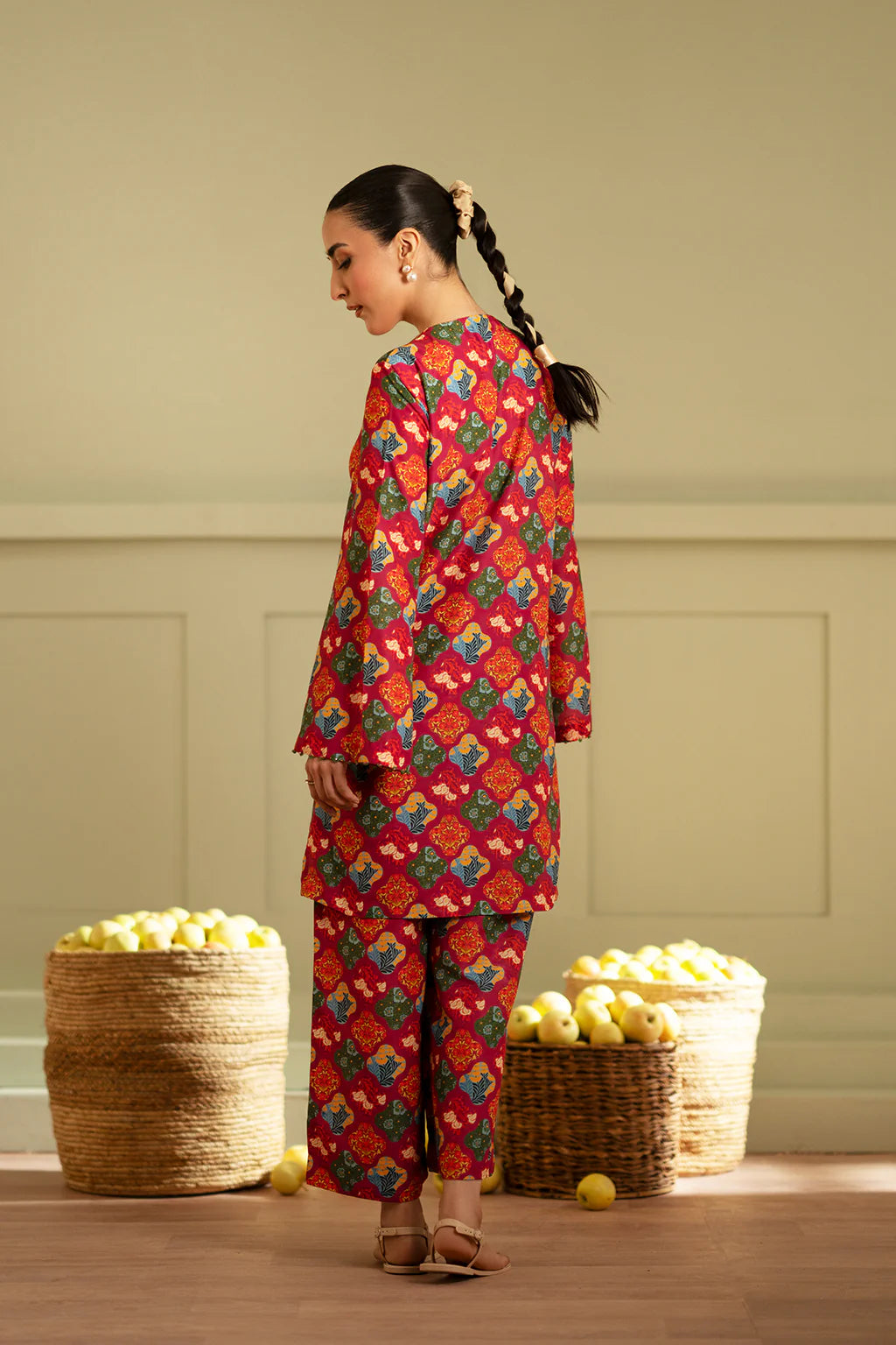 Hot pink printed boxy kurta with drop shoulders, paired with printed culottes.
