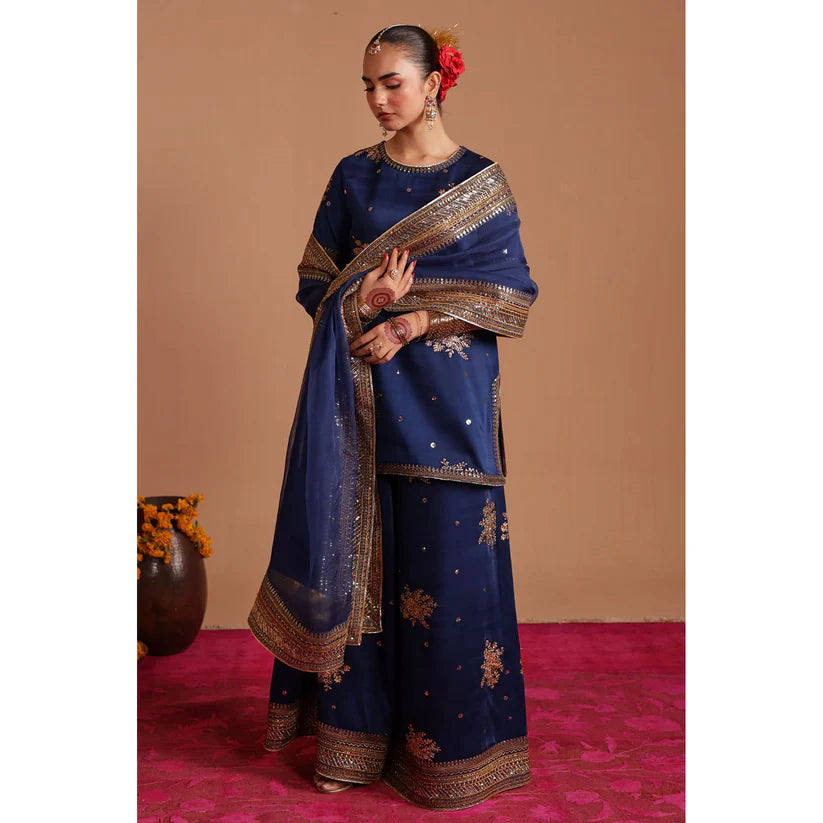 Cobalt Blue shamooz silk short shirt with sharara pants with tilla, badla and sequin embroidery with an organza dupatta.