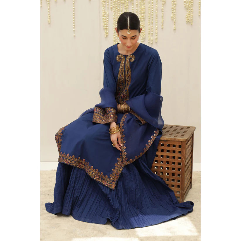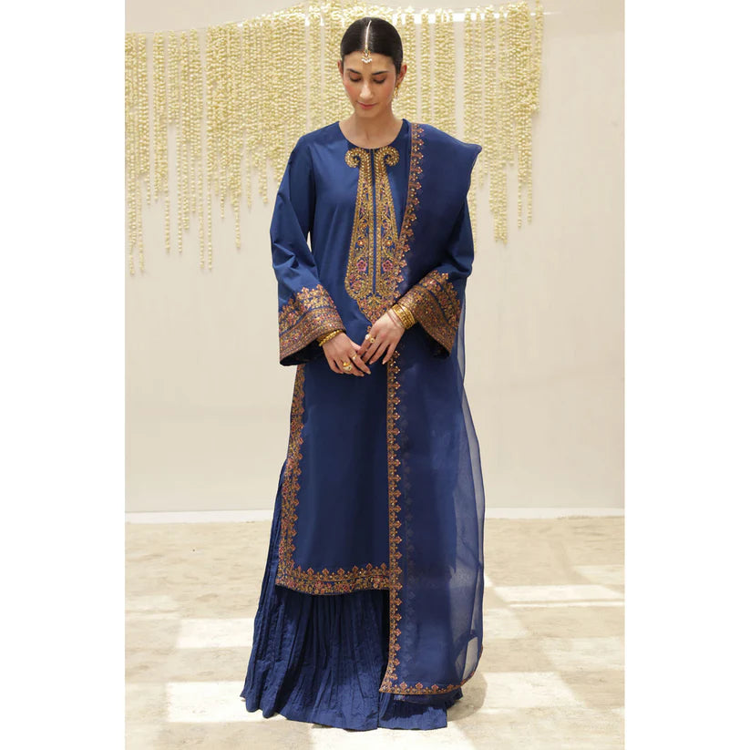 Cobalt Blue cotton shirt with tambako tilla, sequin and resham embroidery paired with Gharara and an organza dupatta.