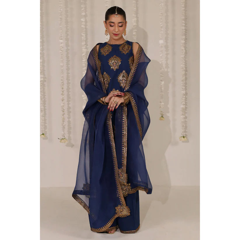 Cobalt Blue Cotton shirt and farshi shalwar with badla and tambako tilla embroidery and an organza dupatta.