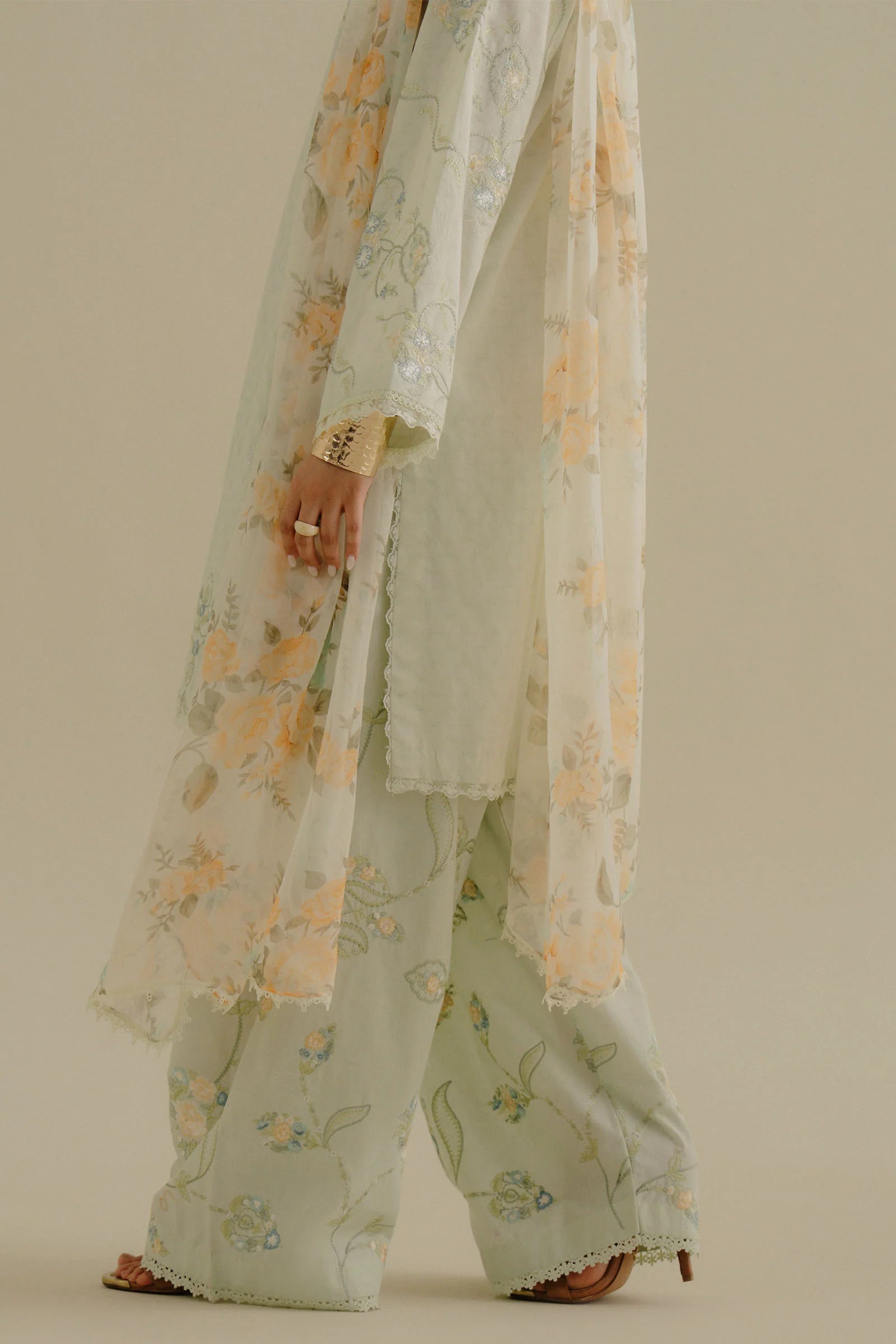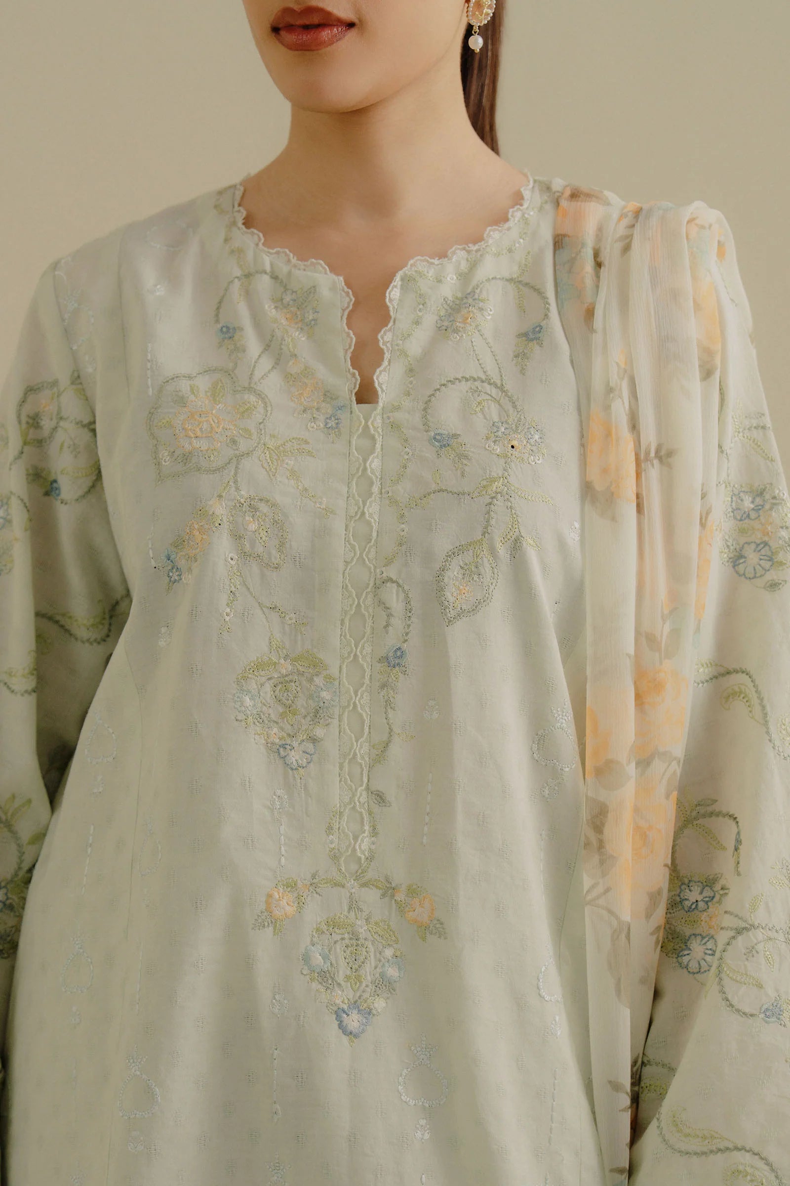 A cool mint green jacquard ensemble layered with subtle embossed patterns and detailed embroidery, paired with a light chiffon dupatta that adds a soft, fluid contrast.