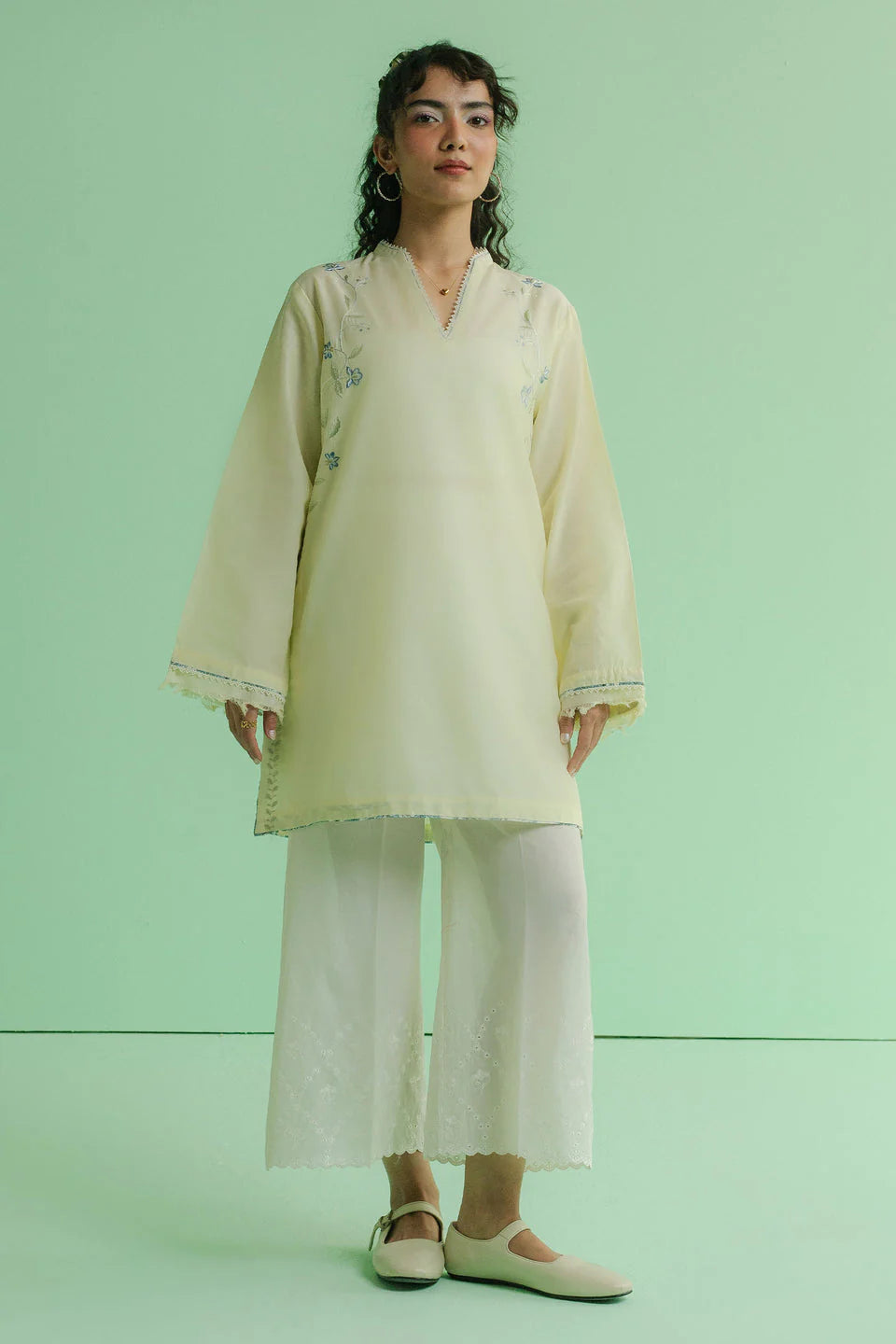 A straight, yellow loose-fit kurta stitched in lawn, featuring composed embroidery on the front. The sleeves are finished with raw, free edges for a relaxed look.