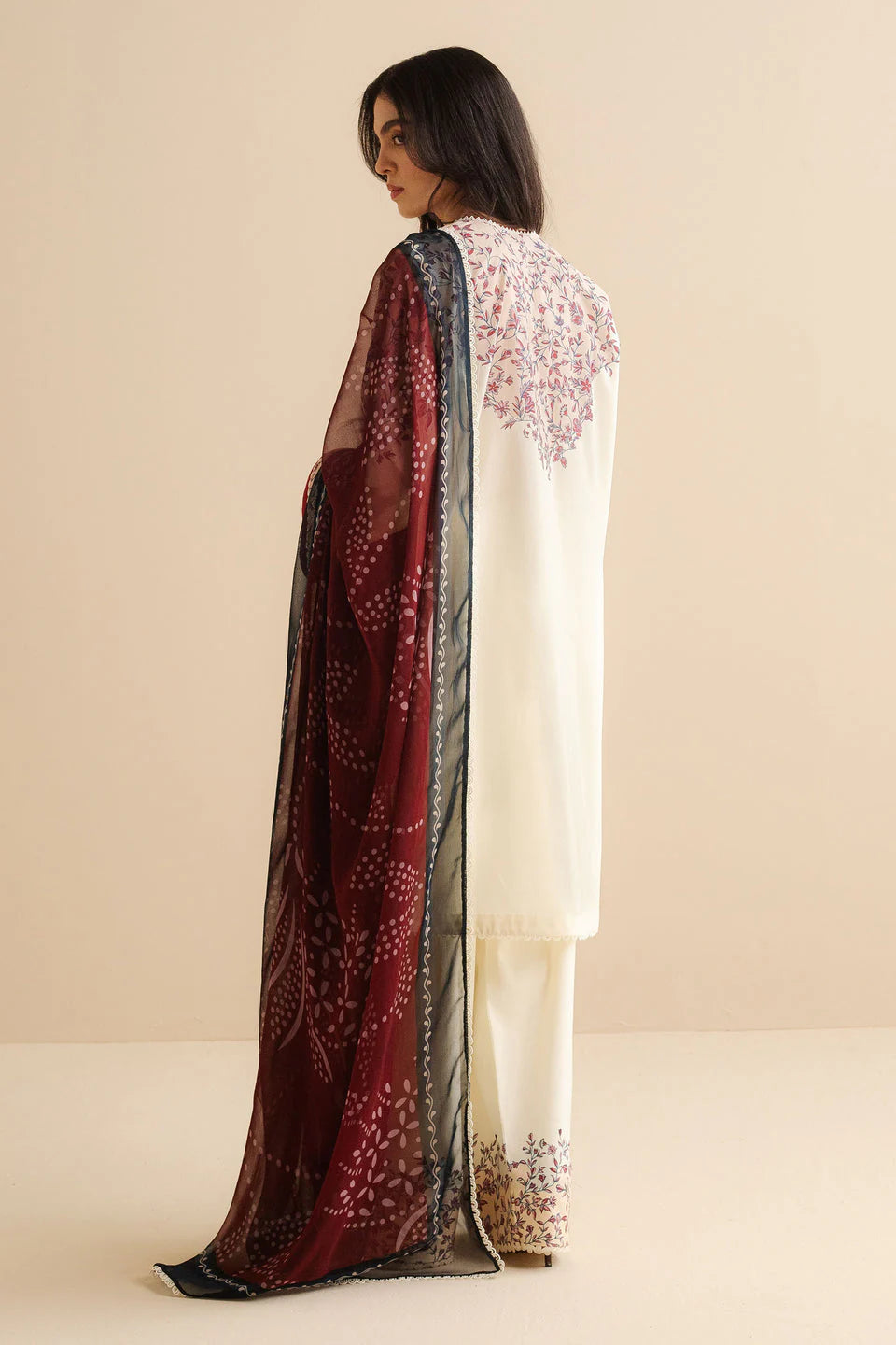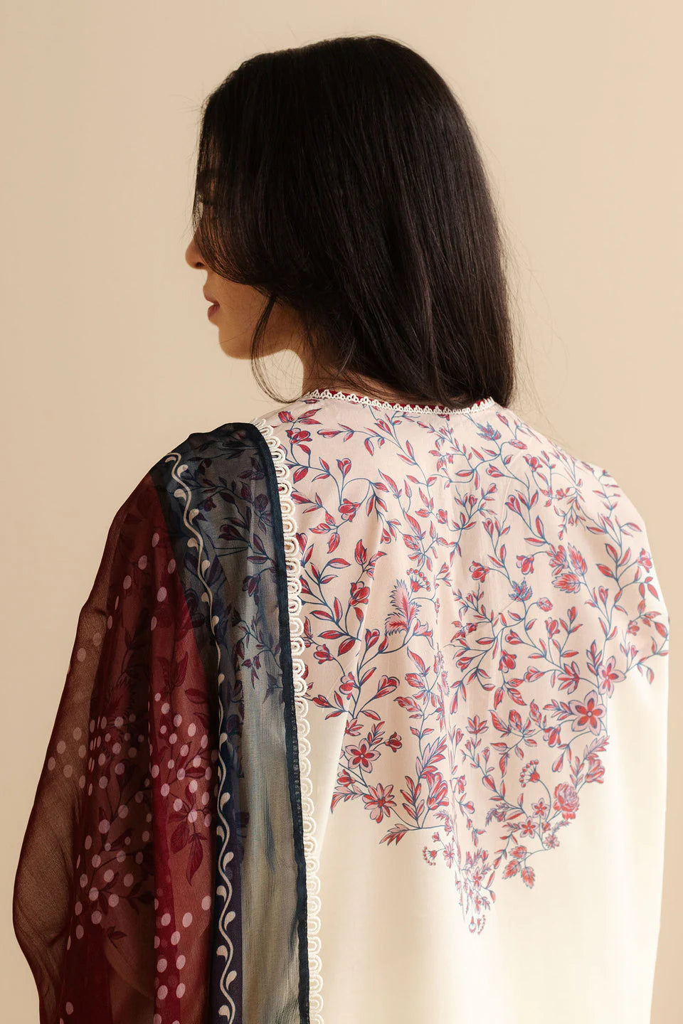 A printed shirt with vintage charm, worn with airy trousers and a gradient dupatta that ties the palette together.