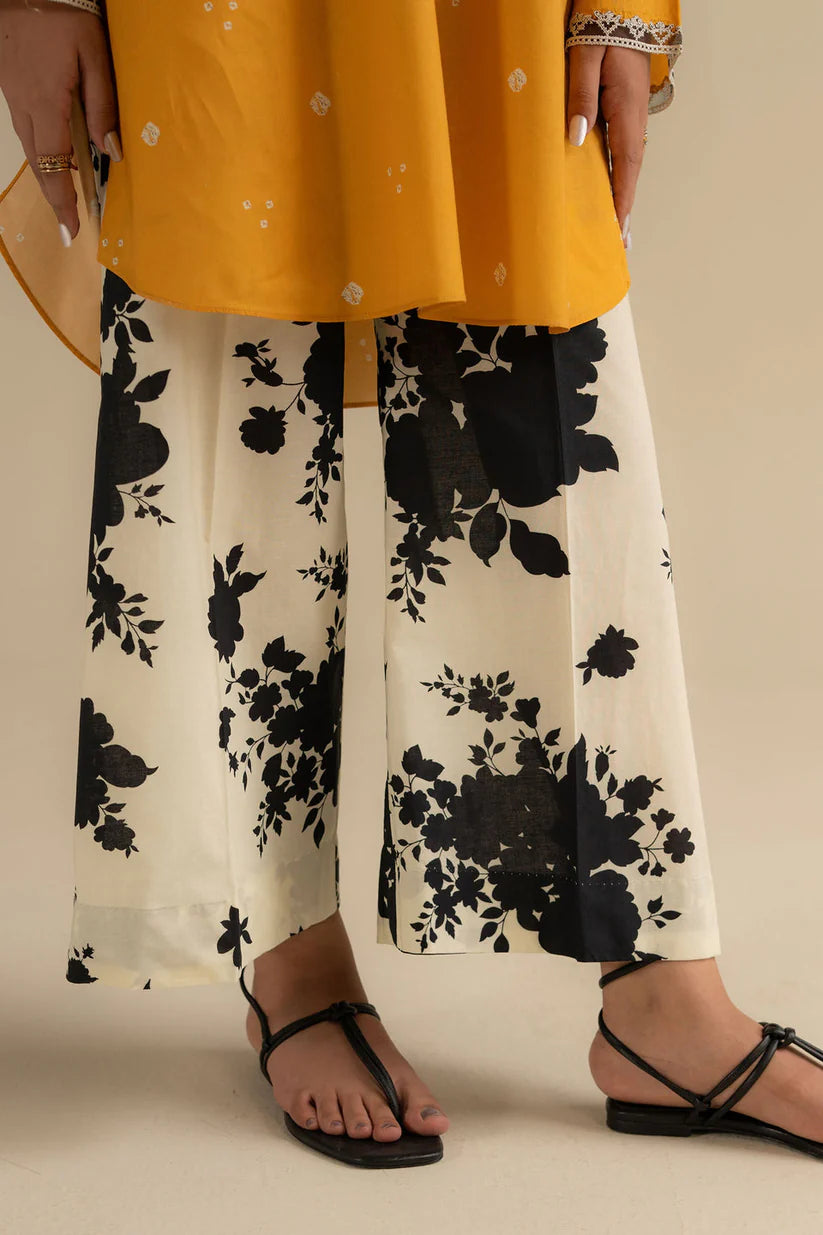 Our mustard straight fit kurta with button details on the front and embroidered sleeves is perfect for summer. It is paired with contrasting black and white printed culottes.