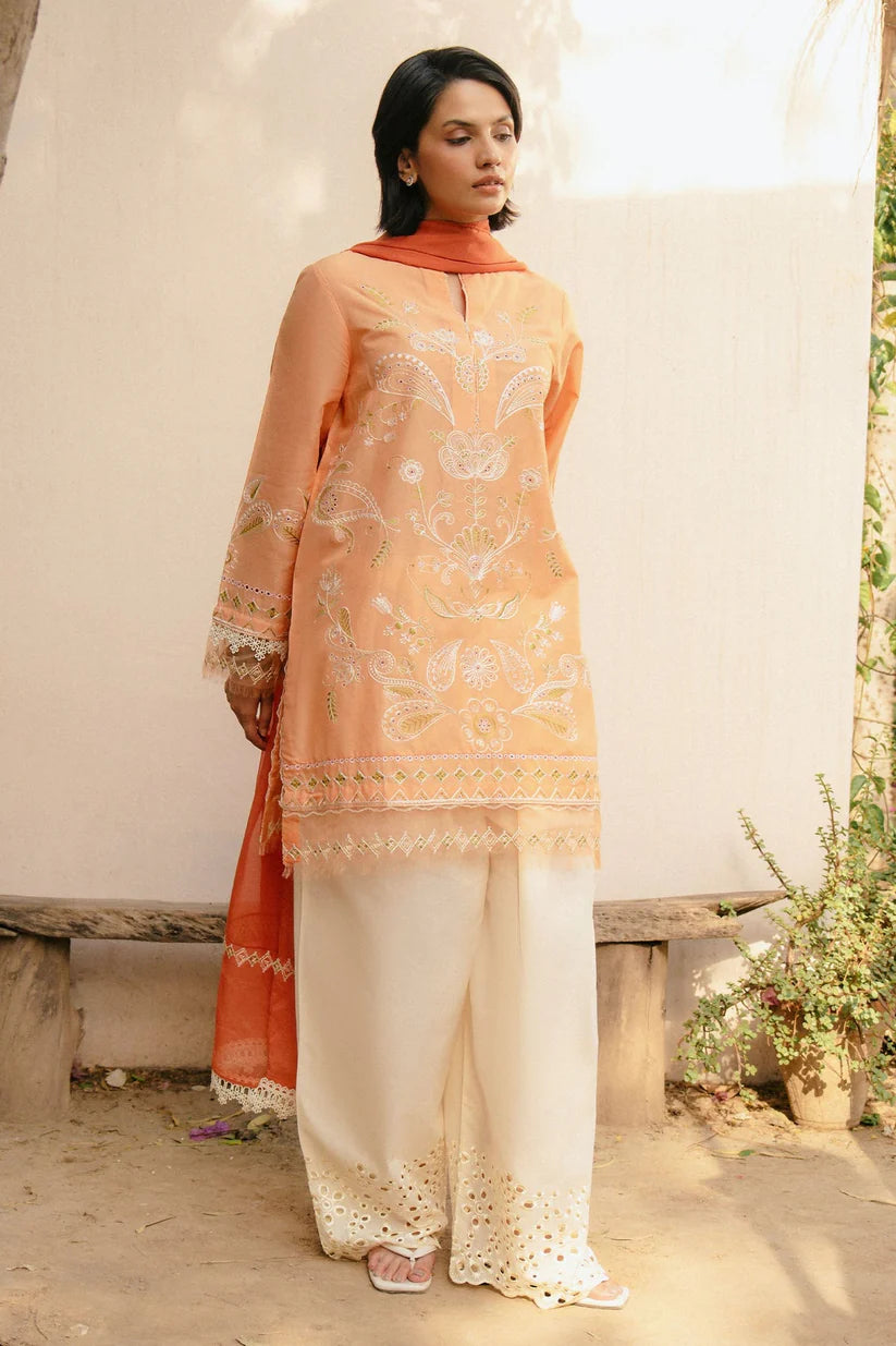 Elevate your wardrobe this season with this effortlessly chic ensemble in a subtle orange hue, brought to life with intricate embroidery in contrasting tones. It is paired with an ivory schiffli farshi shalwar, adding volume and graceful movement to the look. An embroidered dupatta completes the ensemble, enhancing its refined and harmonious aesthetic.