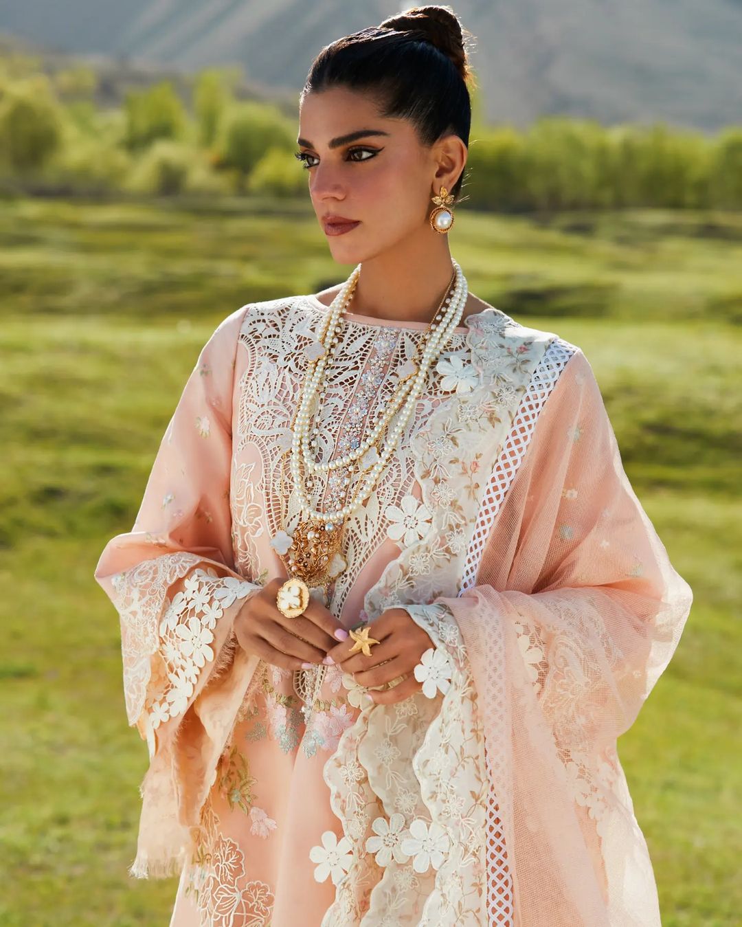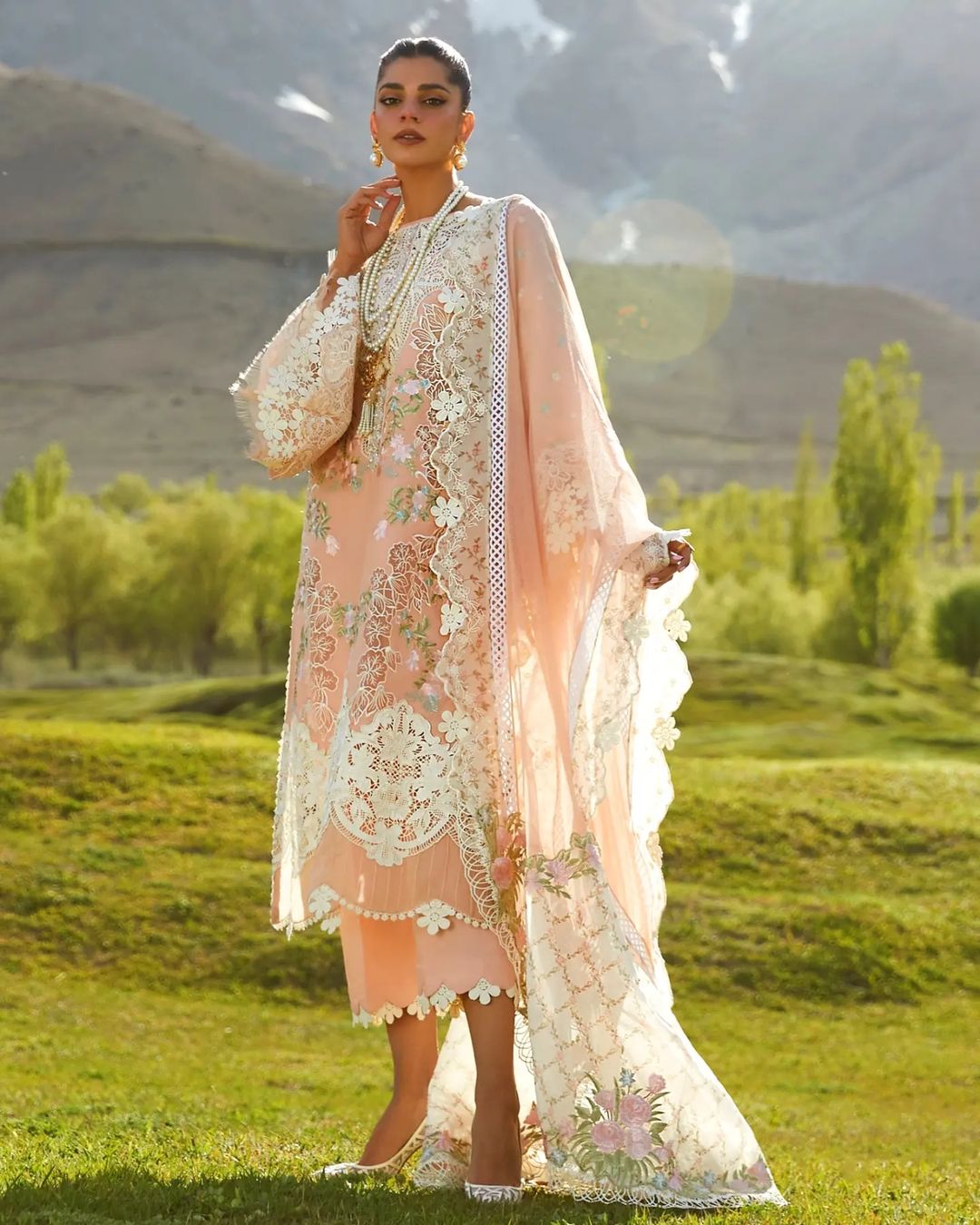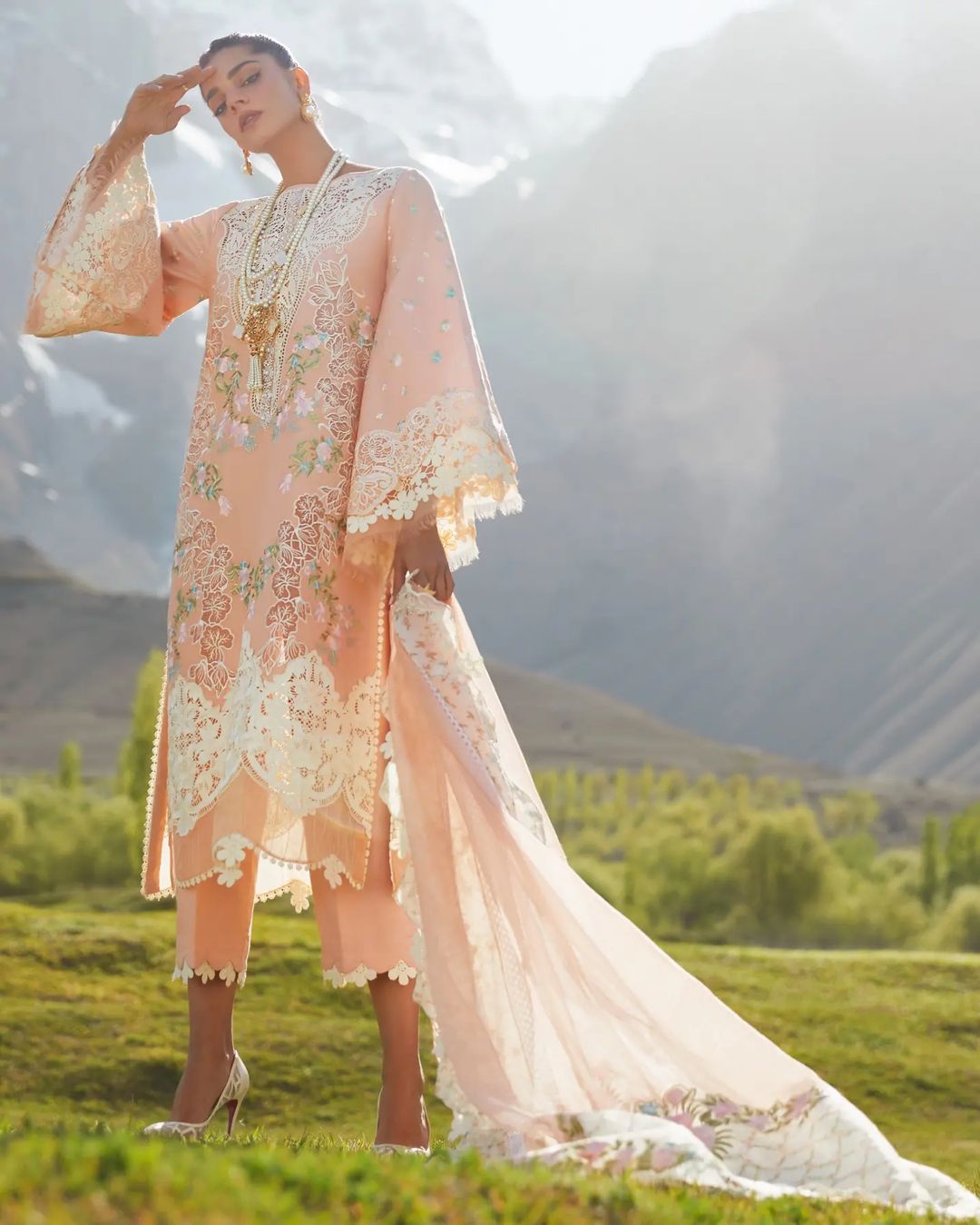 It is no secret that the Crimson X Saira Shakira has come to be known for its signature fabric manipulations, gorgeous play of sheerness and the femininity of its designs. Our fifth design is truly showstopping - it features an all over embroidered front with hand appliqued organza creating a gorgeous peekaboo effect. The neckline and daman are flanked with cutworked lace inserts and a beautiful crystal studded hand embellished plaquette. The sleeves are sprayed with tiny flowers and completed with an impressive lace Border. Print is making a huge comeback and we love incorporating it in new ways - the woven net dupatta is completed with embroidered pallus on printed organza and embroidered scalloped borders for the longer sides.