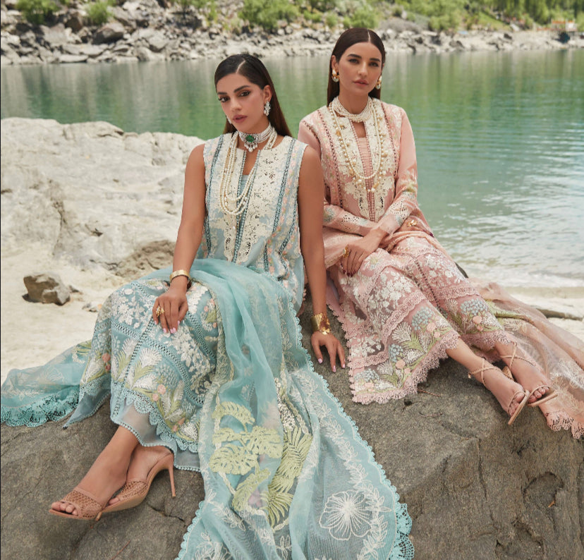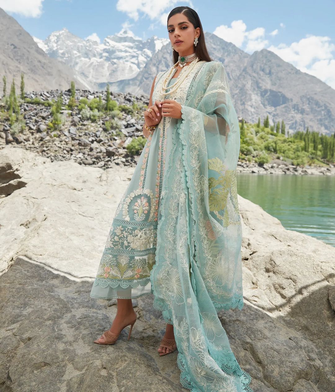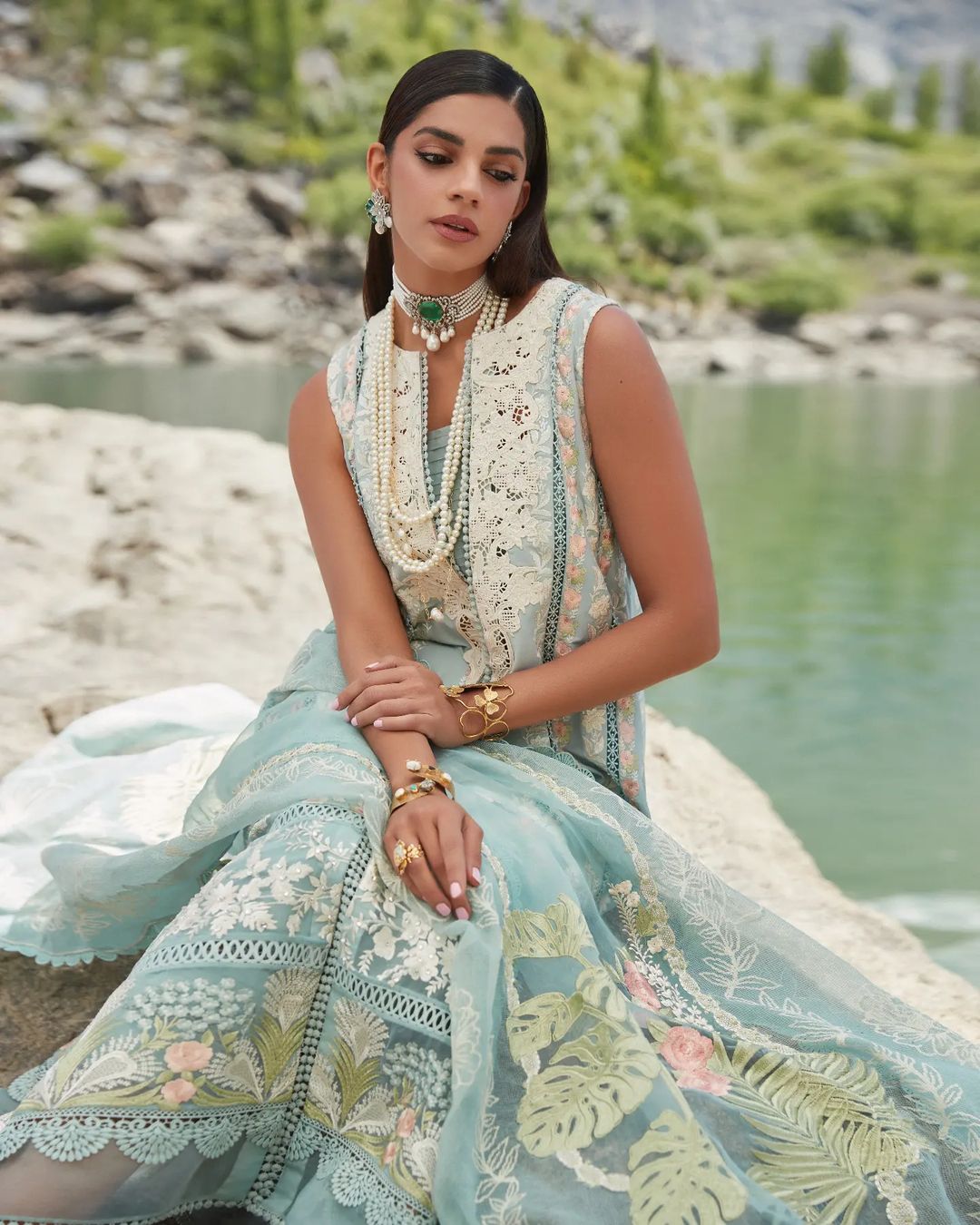 Presenting the Eid Outfit of the Season - A Chikkankari Dreamscape. The shirt is composed in flared chikkankari embroidered panels that can be stitched into an angrakha or a pishwas. The neckline is flanked with cutworked lace and the daman is a series of cascading borders with handworked crystal encrusted details. The dupatta is hand printed in white emboss florals around a centralised panel of oversized foliage and flowers. Easy to transition from day to night, this is the Eid Outfit that dreams are made of.