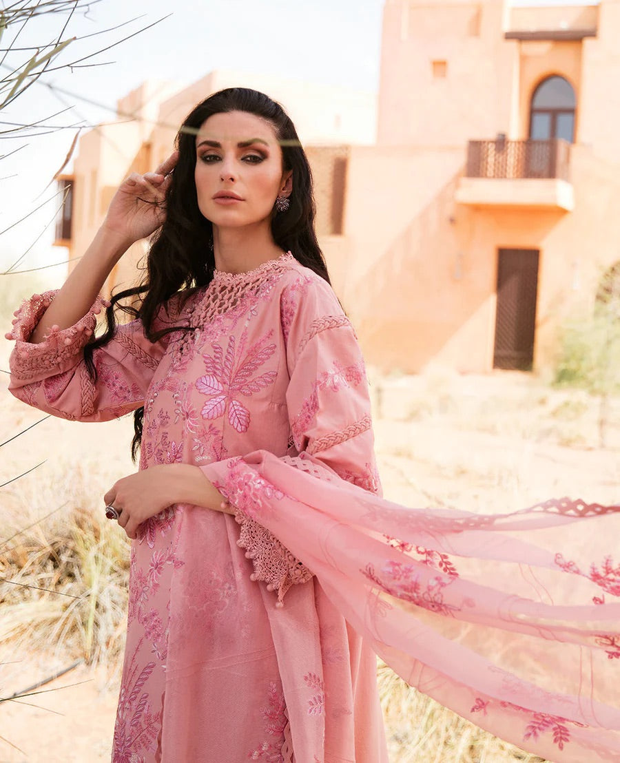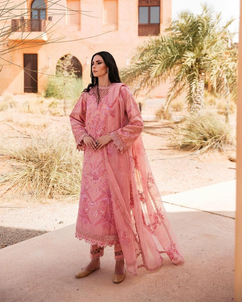 A stunning peach lawn outfit, indulge in the sheer bliss of summer with the monochromatic floral embroideries that are a sight to behold, created using the tiniest stitches to produce exquisite designs. The intricate details of the flowers, leaves, and vines are crafted with an artist's precision, offering a truly magnificent display of nature's beauty. The addition of schiffli borders takes it up a notch, highlighting the delicate charm of this ensemble. Boasted by by a peach Chanderi net dupatta with running motifs that oozes grace and elegance.