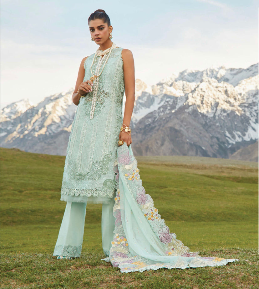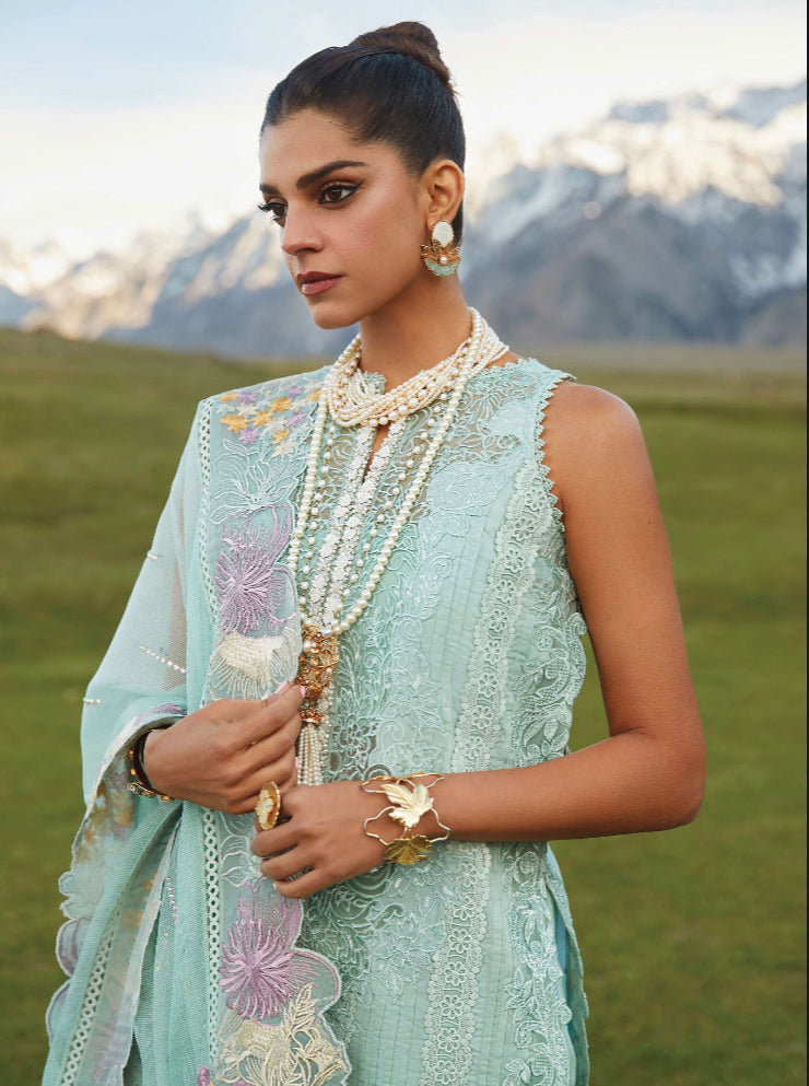 Hold your breath, Ladies - the best look from Crimson Luxury Lawn by Saira Shakira has arrived! Pleated Perfection features a hand pleated front with lace inserts, organza appliqued and sequinned neckline and daman inserts and gorgeous worker side panels. The neckline is finished with a handworked crystal plaquette and the pant hem features an organza appliqued border. The STUNNING dupatta is entirely hand encrusted with Austrian crystals and flanked by impressive pastel colored floral pallus and thick embroidered borders.