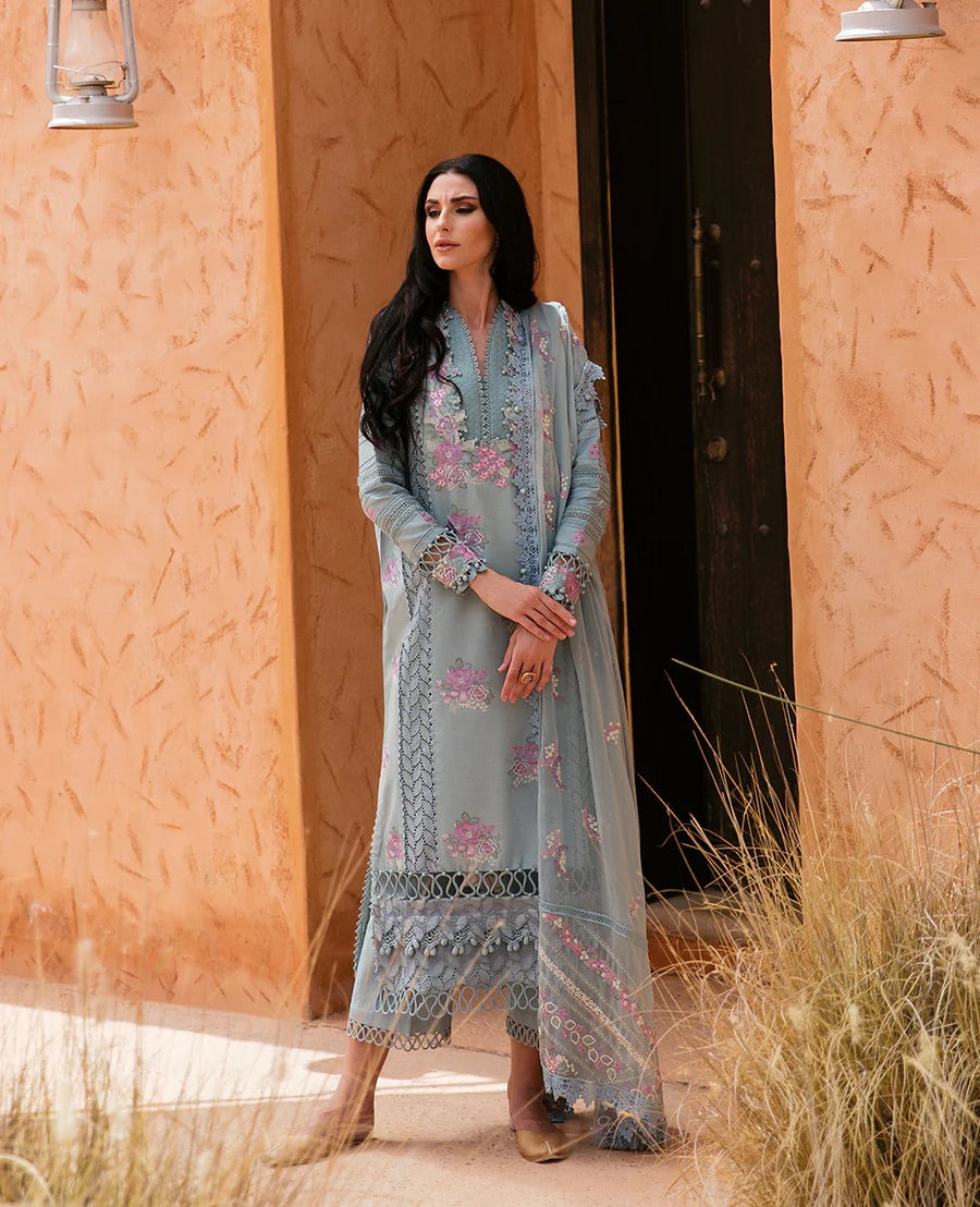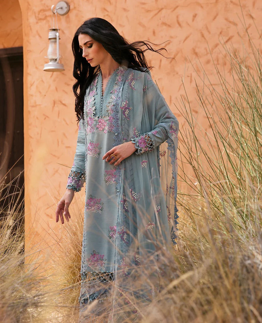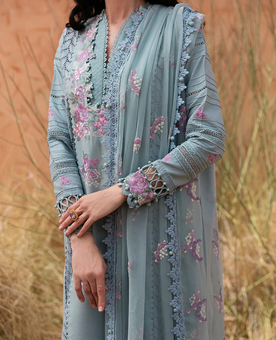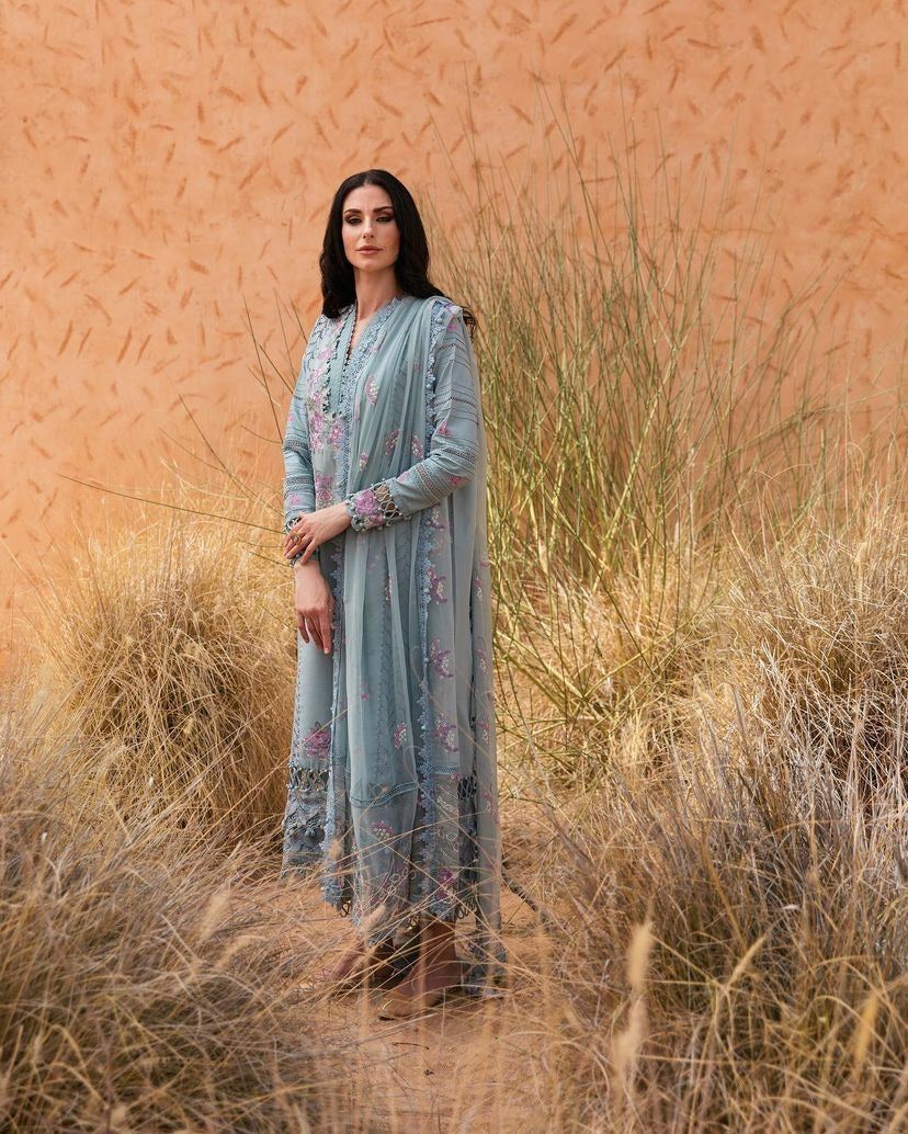 Embracing the rich heritage emirati culture, this beautiful lawn outfit features the intricate and colorful Parsi gara motifs that originated in the 19th century. These vibrant motifs are embroidered onto the aqua shirt with beautifully composed embroidery all over, bringing an element of sophistication and elegance to the ensemble. The lightweight chiffon dupatta with its flowing embroidery adds an extra touch of glamor to complete the look. This outfit exudes timeless beauty and style that's perfect for a hot summer day.