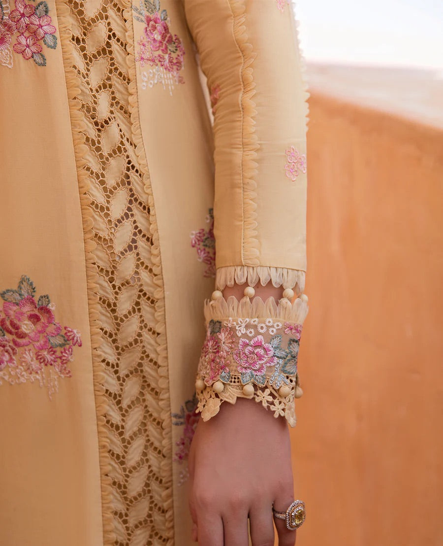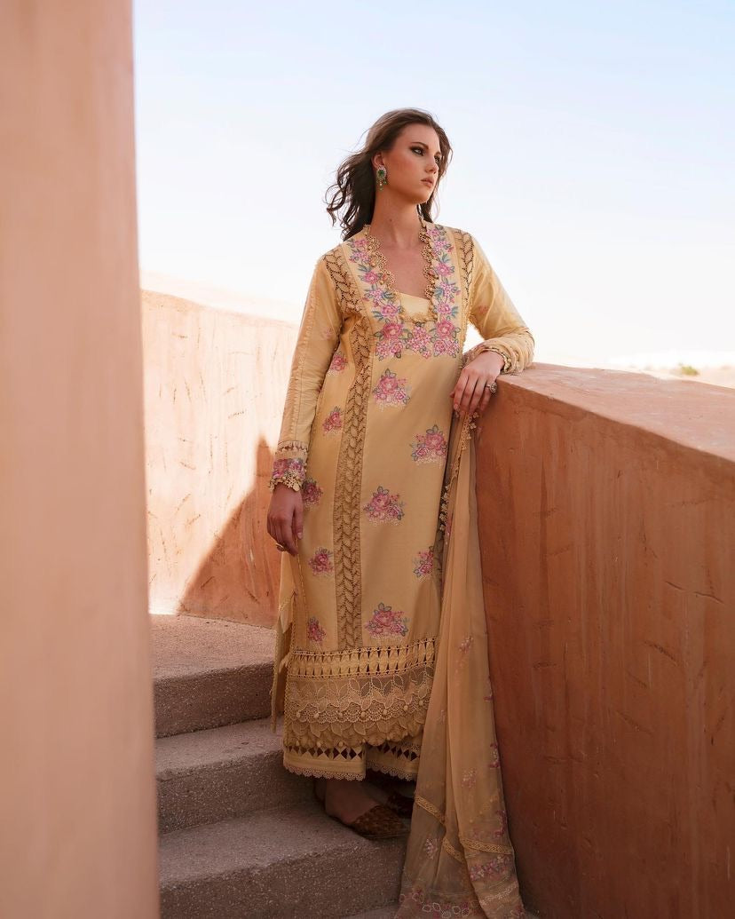 A picturesque portrayal of elegance, this fusion outfit showcases the beauty of mustard tones on a meticulously embroidered shirt with Parsi gara motifs - a delicate and stunning embroidery style originated in Persia featuring complex compositions depicted in bright and captivating colors. The flowing chiffon dupatta, highlighted with tasteful running embroidery, adds a touch of grace and finesse to the ensemble. Whether you're enjoying the warm summer breeze or attending a chic soiree, this impeccable outfit is sure to make heads turn.
