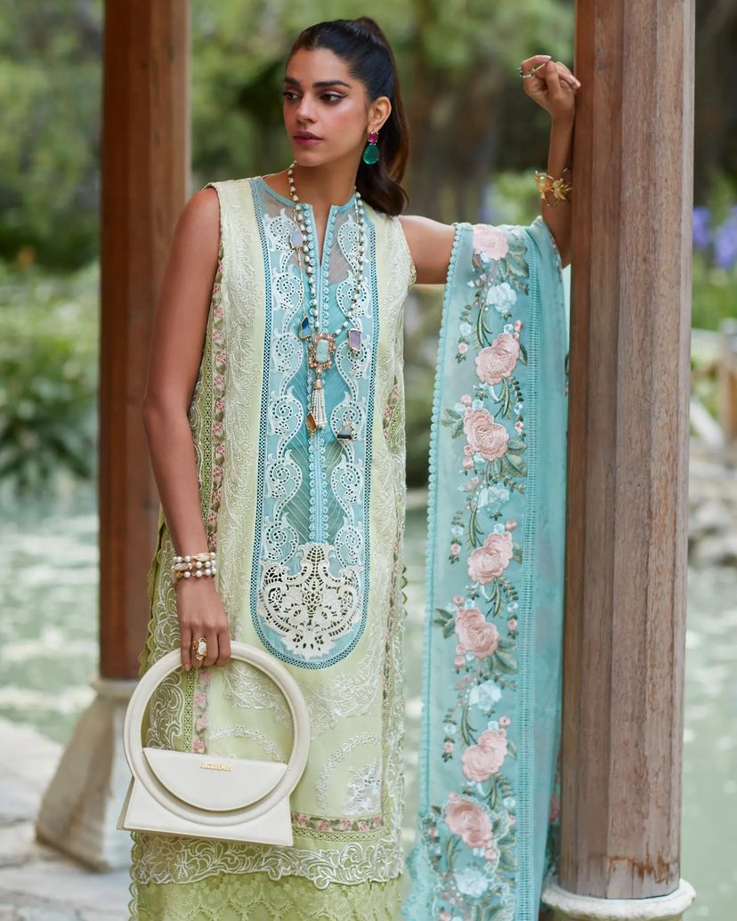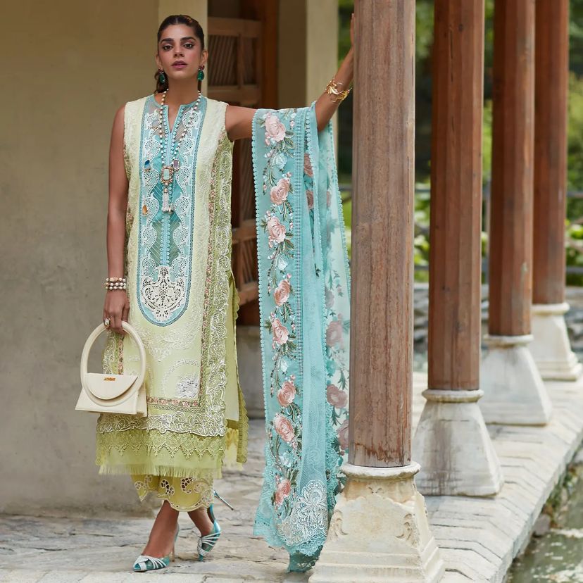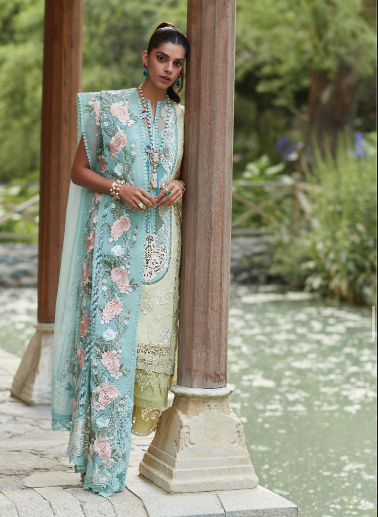 Our third reveal features a color blocked front in gorgeous shades of lime, mint and aqua with a myriad of techniques that are a Crimson X Saira Shakira signature - the center panel is cutworked by hand into a lace pattern, the second panel features ghaara embroidery around florals in sketched outlines and the outermost panels are laser cut organza inserted in lawn. The GORGEOUS dupatta features lace and ghaara embroidered floral pallus and the longer sides are finished with meticulously rendered floral borders. The cutworked pants finish the look beautifully.