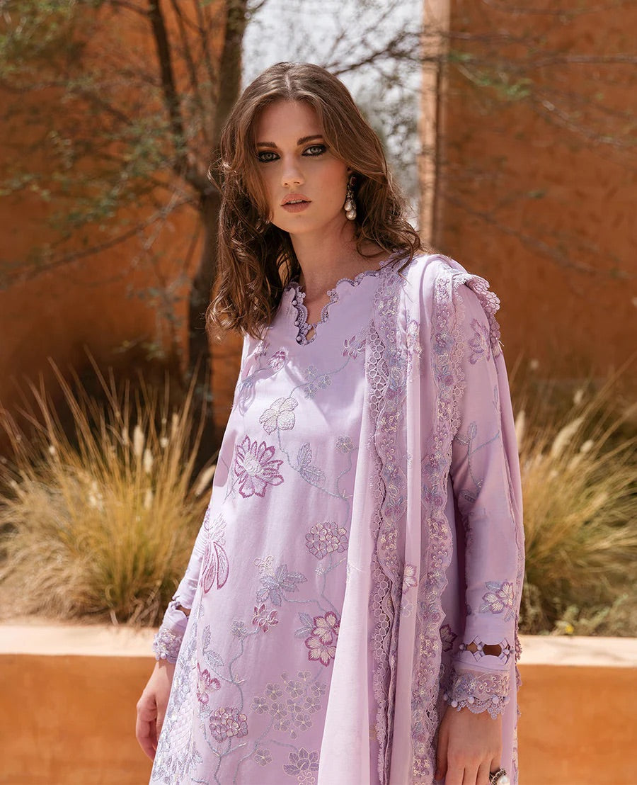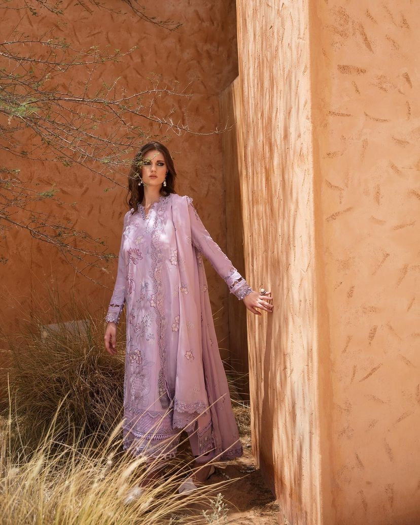 Resplendent shades of lilac interweave in symmetrical harmony, amidst an intricate display of meticulously crafted floral embroidery. This magnificent summer ensemble boasts an effortless and graceful silhouette, rendering it an ideal choice for balmy summer evenings. chiffon dupatta, adorned with exquisite embroidery, adds a bewitching touch to the overall look. In essence, this outfit is a sublime manifestation of floral artistry, impeccably executed with finesse and panache.