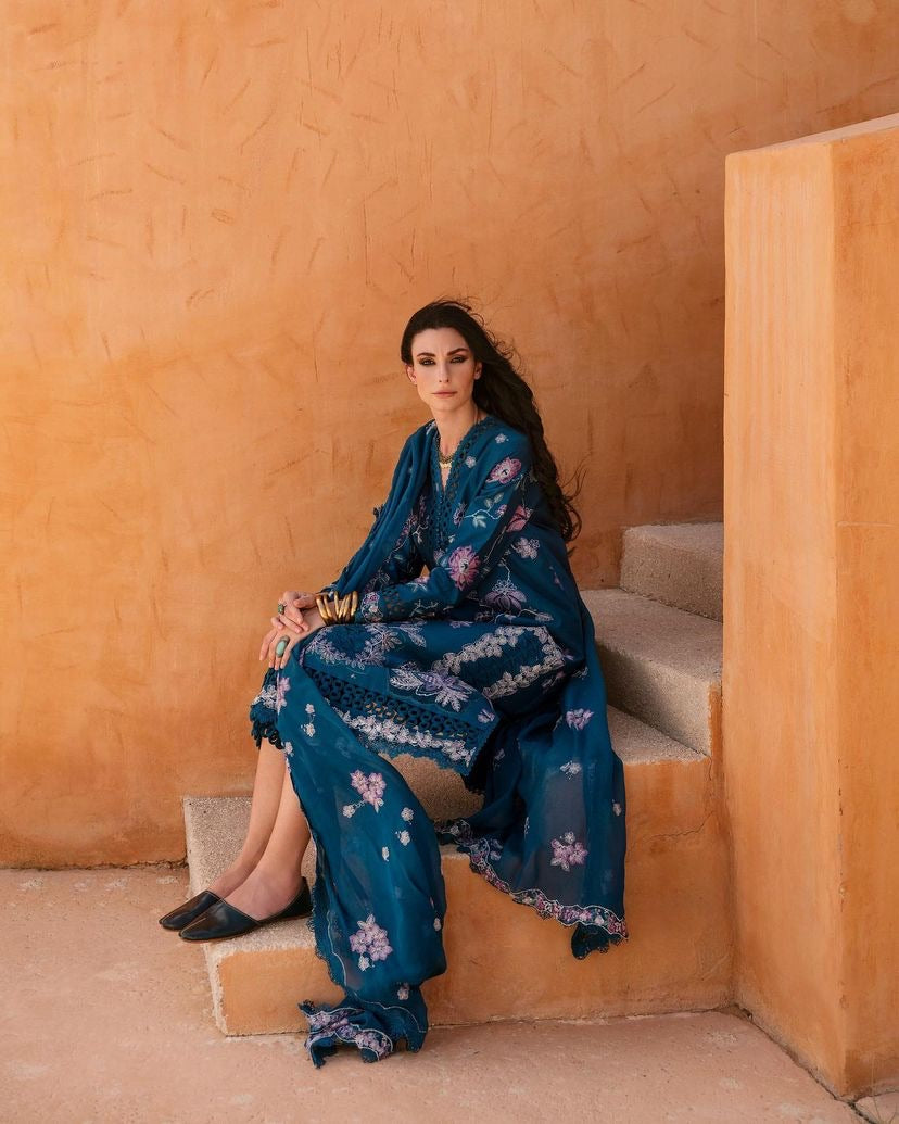 Glimmering hues of teal, pink, plum, and blue dance in symmetrical harmony amidst an intricate display of floral embroidery. This stunning summer outfit boasts an effortless and flowy silhouette, making it the perfect pairing for those warm summer nights. And with the contrasting chiffon running embroidered dupatta in teal, this look is nothing short of enchanting. Simply put, a truly divine display of floral artistry.