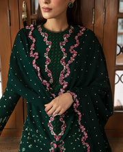 The captivating interplay of emerald greens, vibrant reds, and soft pinks in this ensemble forms a stunning silhouette that draws the eye. Exquisite detailing shines through with intricate floral and leafy patterns elegantly embroidered on sumptuous emerald green karandi fabric, infusing the piece with a touch of refined grace. Completing this opulent look is a beautifully coordinated viscose shawl, adorned with flowing floral borders that effortlessly enhance the ensemble, elevating it to the pinnacle of sophisticated luxury.