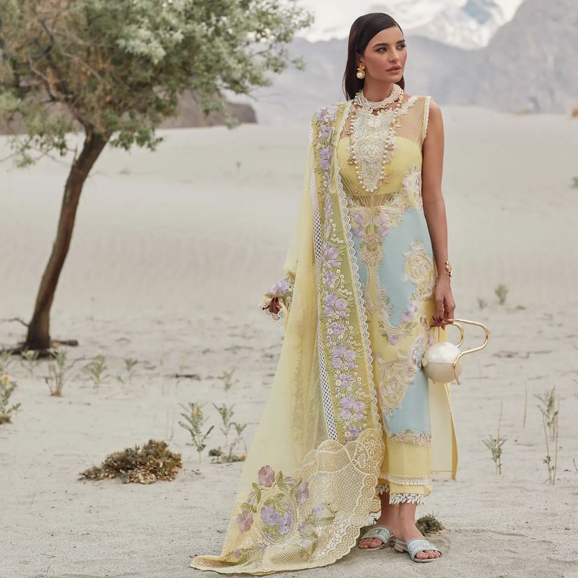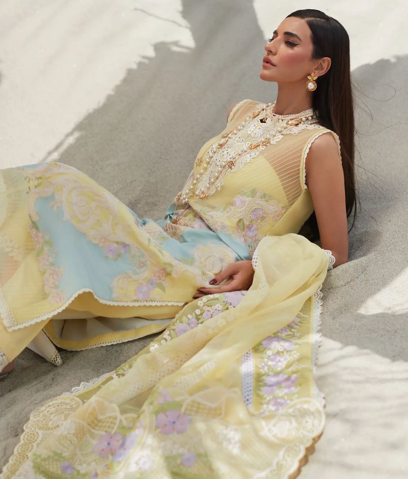 If UNBELIEVABLY GORGEOUS had a face - Sadia Khan stuns in this gorgeous sixth reveal from Crimson Luxury Lawn by Saira Shakira. It features an intricate marori worked pale yellow front with aqua hand appliques. Florals in gorgeous shades of lilac cover the entire front and the neckline is hand encrusted with crystals lending the perfect amount of bling. The dupatta is completed with dense floral borders along the lengths and impressive lace and floral pallus.