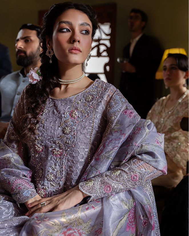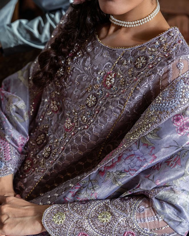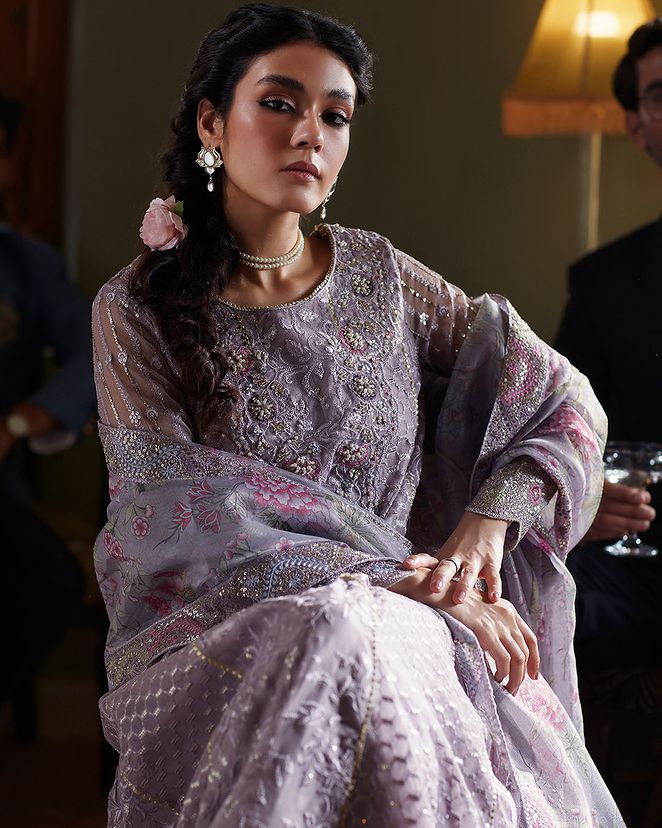 Eira, a mesmerizing outfitin lilac that embodies grace and glamour, is a true masterpiece in the realm of fashion. This enchanting ensemble features an intricately embroidered sequin and hand-embellished neckline on delicate organza net, creating a symphony of opulence and elegance. With meticulous craftsmanship and exquisite finishing touches, Eira is destined to captivate hearts and turn heads.