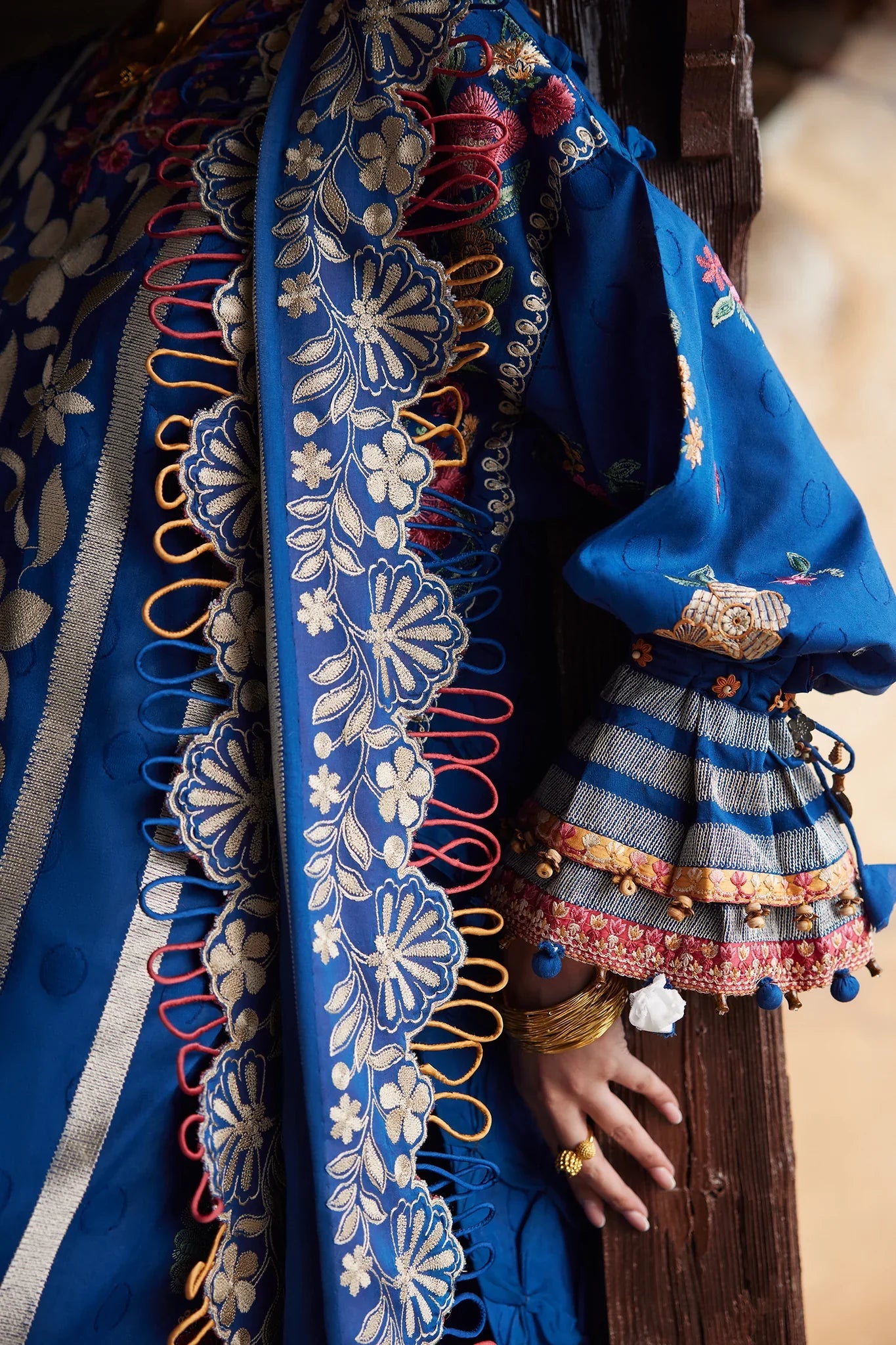 Soft, detailed embroidery graces the neckline and sleeves, enhancing the piece’s rich textures and creating a harmonious dance of craftsmanship. The tonal voile dupatta, adorned with vivid floral scalloped borders and finished with playful tassels, adds gentle movement and an air of sophistication to the ensemble.