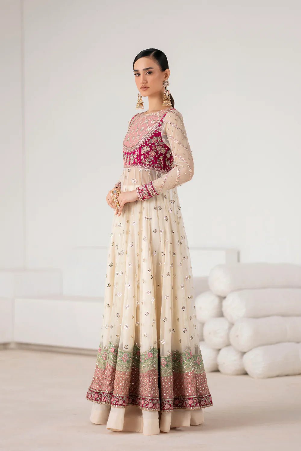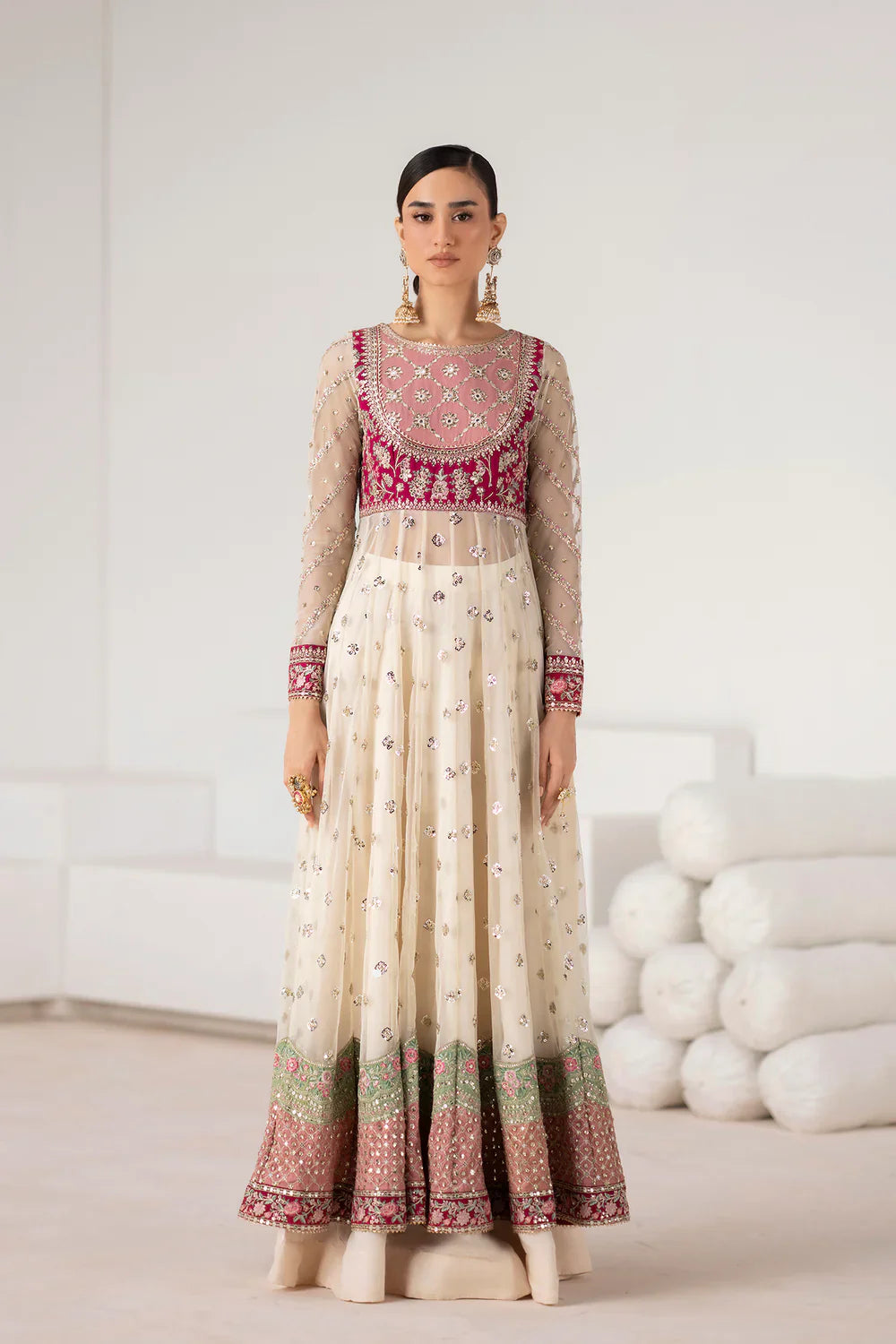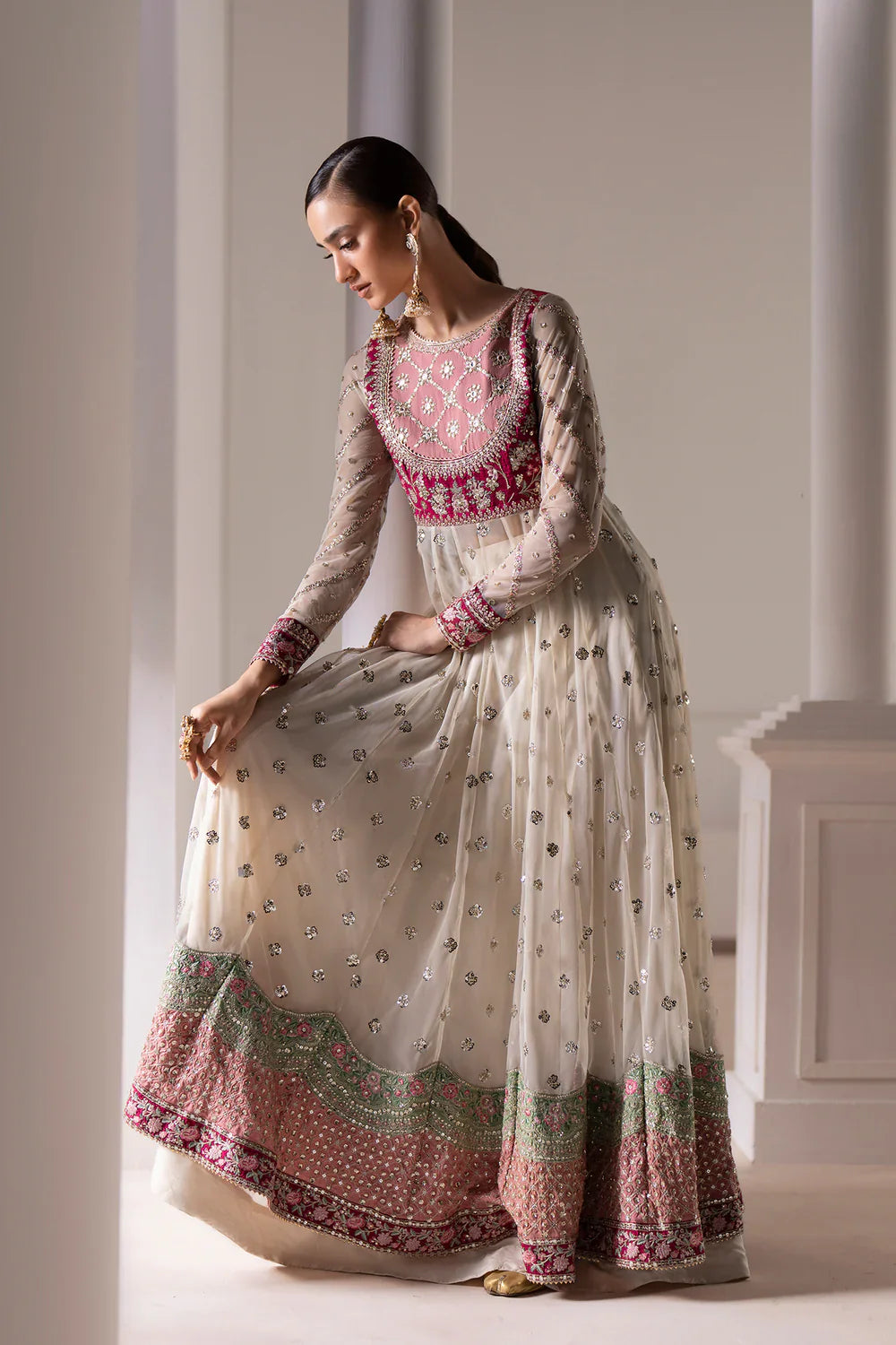 Emerge as a vision of grace and festivity in this stunning embroidered pishwas and lehenga. The long, flowing pishwas in a soft off-white is a masterpiece of design, with a richly embellished bodice in a deep fuschia and gold, featuring intricate embroidery. The sheer, full-length sleeves are adorned with delicate sequin work, adding a subtle shimmer. The flared silhouette of the pishwas is dotted with sparkling sequins, and the hemline is beautifully finished with an embroidered border in shades of pink and sage green. This magnificent piece is perfect for making a grand entrance at any celebration.