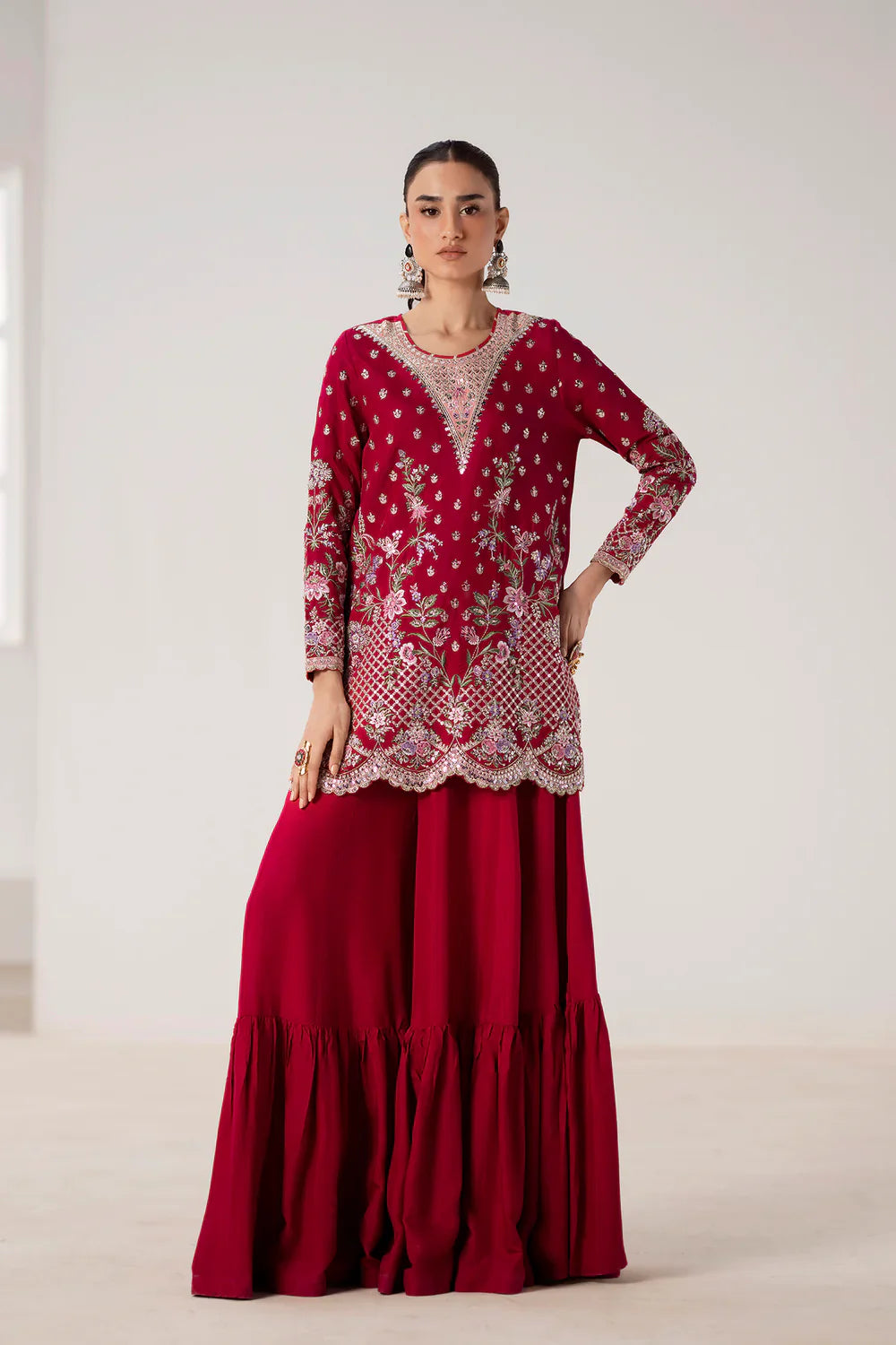 Command attention in this breathtaking embroidered suit, a perfect blend of festive color and refined craftsmanship. The vibrant ruby shirt is a canvas for intricate embroidery in shimmering silver, gold, and delicate pink, creating a stunning and sophisticated pattern. The heavily detailed neckline and border, along with the embellished sleeves, add a touch of regal elegance. The ensemble is completed with a full, flowing gharara in a matching ruby hue, featuring a pleated hem that adds movement and grace. This suit is the perfect choice for a grand celebration, ensuring you make a memorable statement of timeless style.