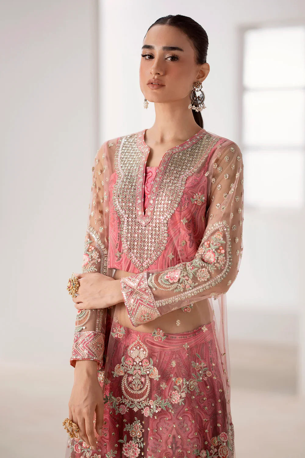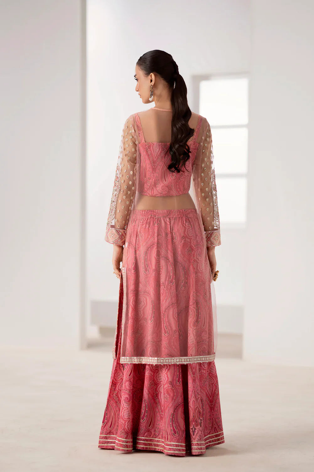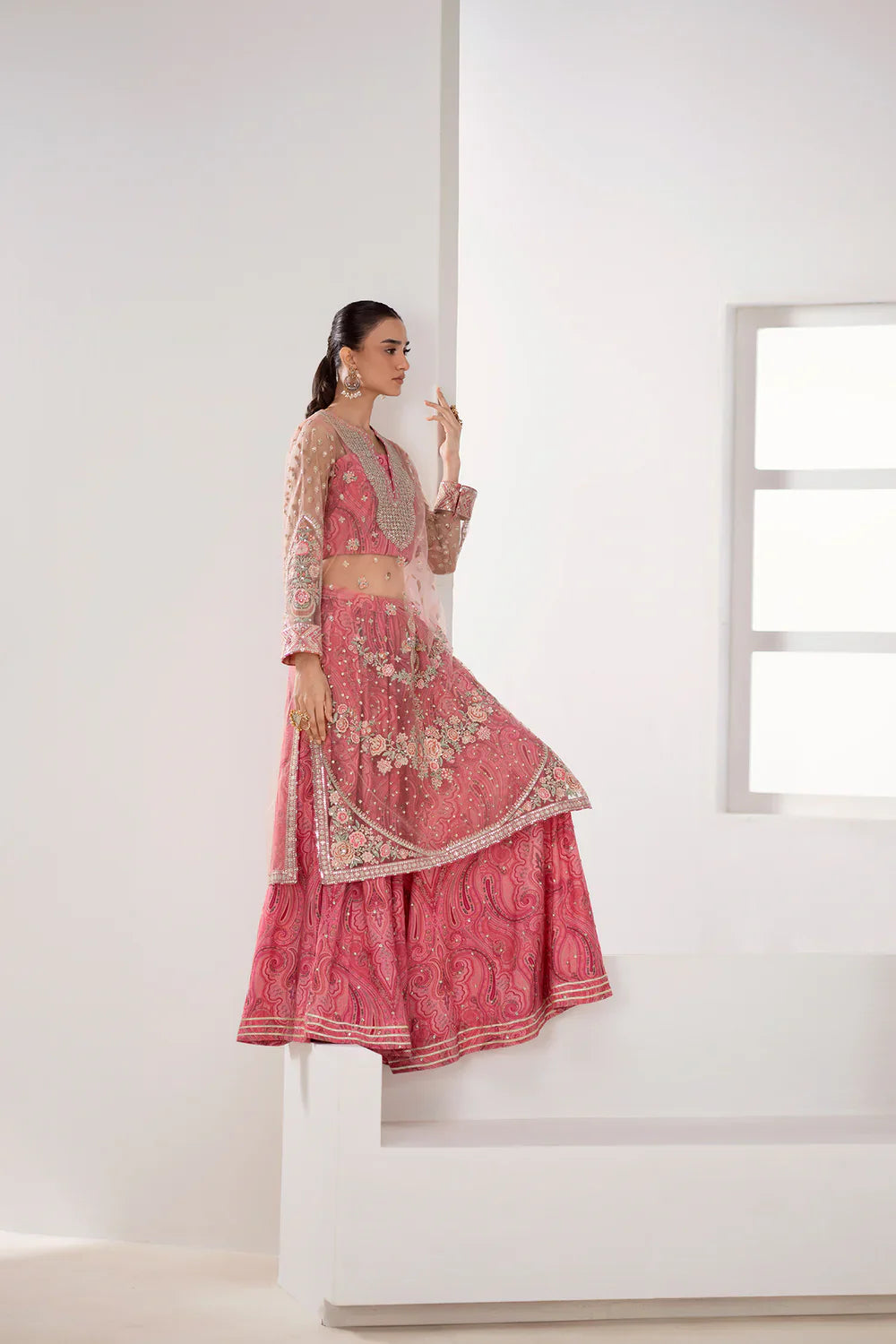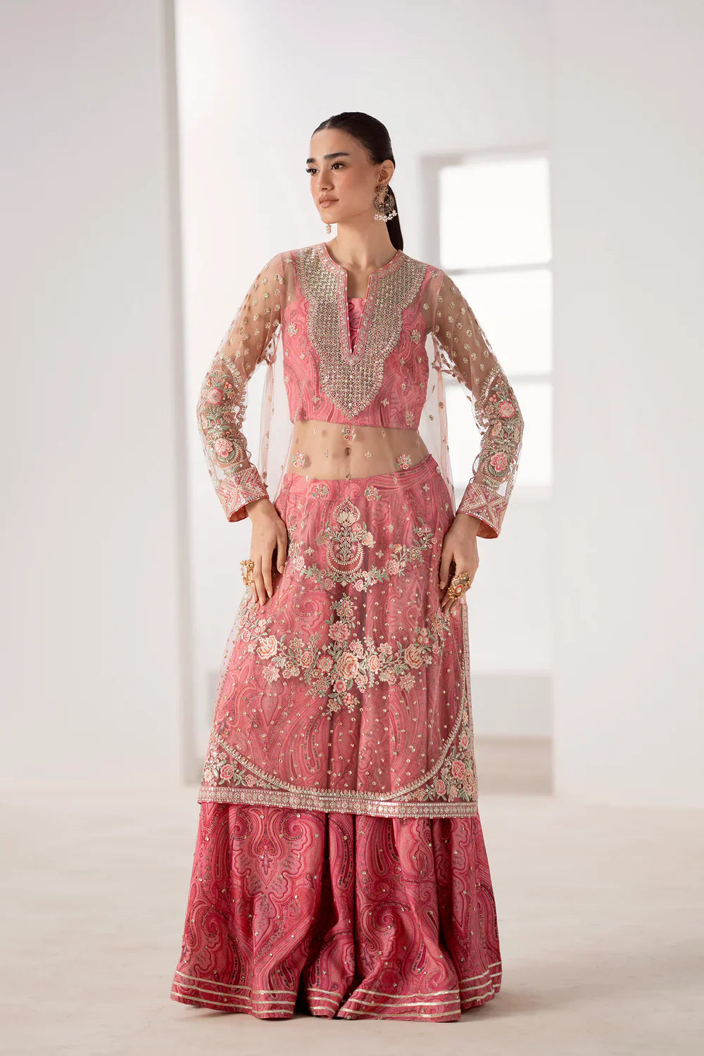 Grace yourself in this magnificent embroidered suit, a masterpiece of elegance and festive charm. The ensemble features a sheer, shirt crafted from a delicate blush-pink fabric, richly adorned with intricate silver and pink floral embroidery and shimmering sequins. It is layered over a matching inner shirt, and the set is completed with a full, flowing sharara. The hem of the sharara is beautifully finished with gotta work. This suit is designed for grand occasions, ensuring a look that is both luxurious and unforgettable.