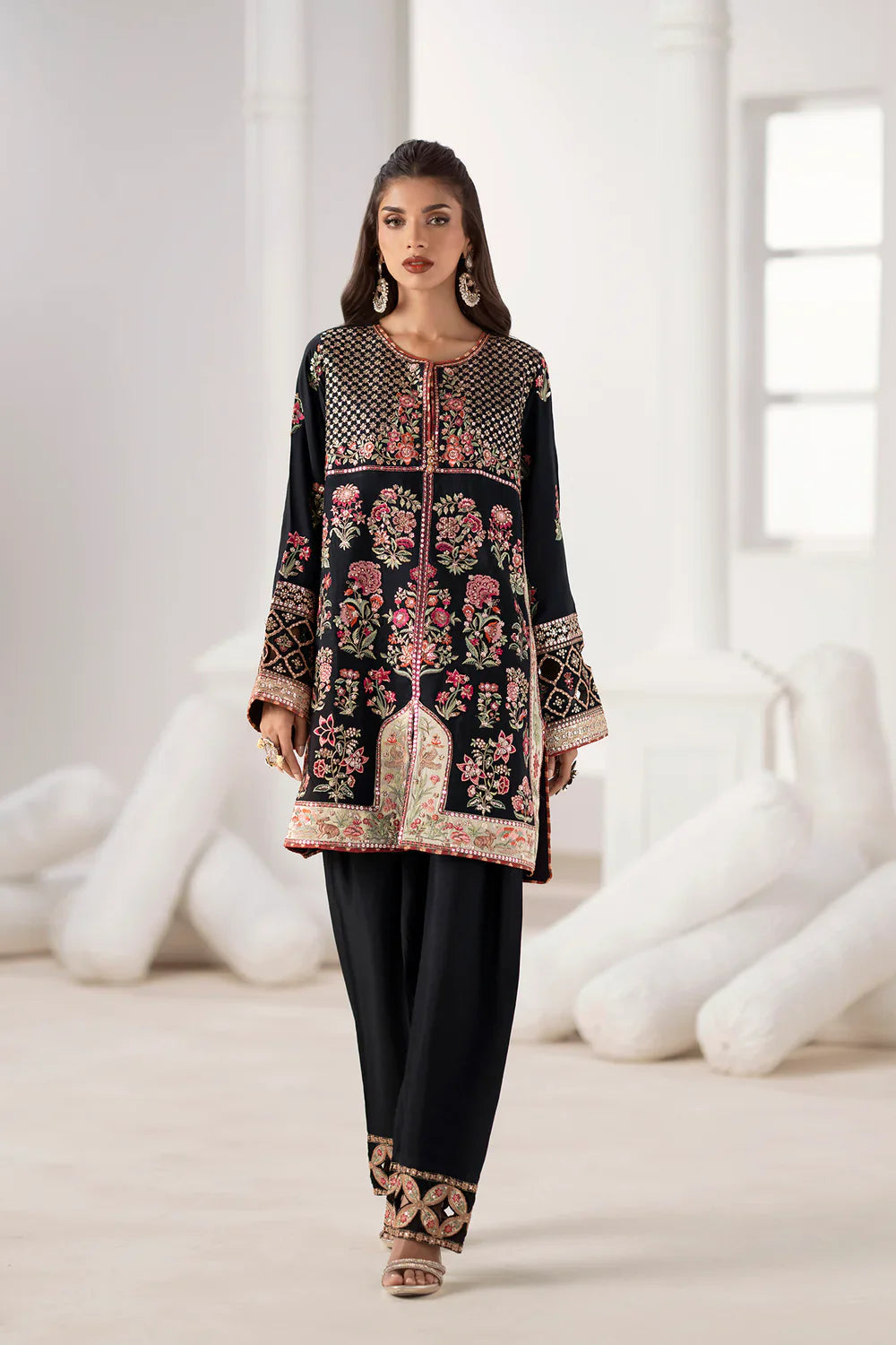Step into timeless elegance with this captivating embroidered suit. The rich black fabric is a striking backdrop for the intricate embroidery in vibrant shades of pink, gold, and green. Delicate floral and vine motifs gracefully cover the shirt, while a heavily embellished neckline and broad cuffs add a touch of regal charm. The set is completed with matching black shalwar, creating a sophisticated and cohesive silhouette. This suit is the perfect choice for a grand celebration, ensuring a look that is both luxurious and unforgettable.