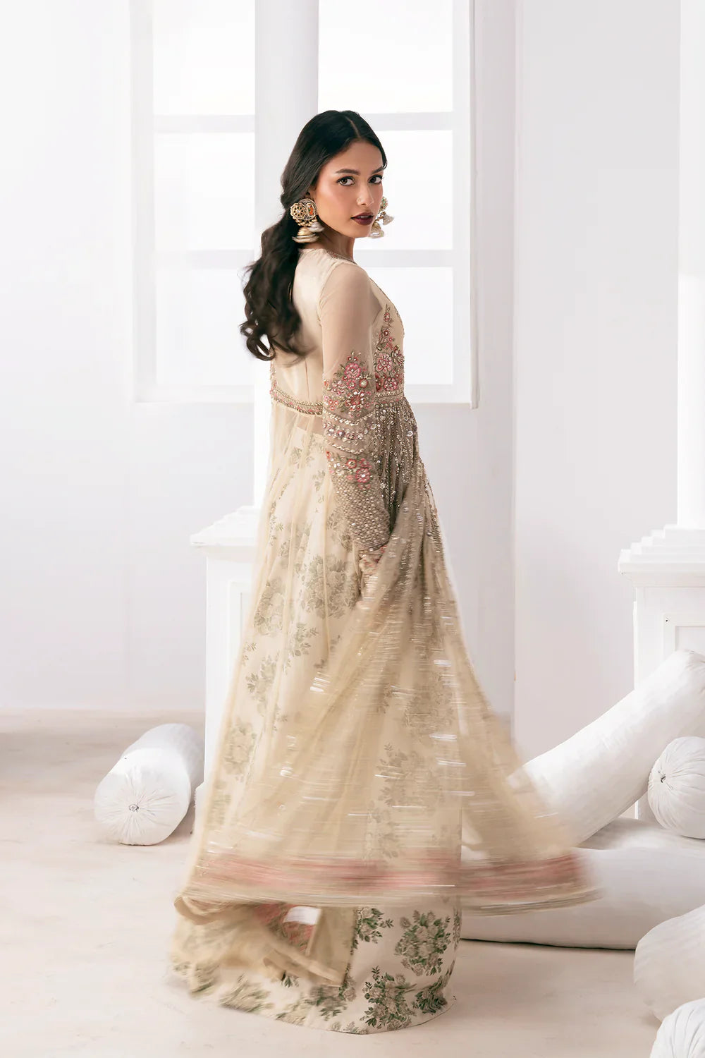 Drape yourself in ethereal elegance with this breathtaking embroidered pishwas and lehenga. The flowing pishwas, in a soft off-white, is a masterpiece of design, with a richly embellished bodice and long, sheer sleeves. The intricate embroidery in shades of pink, green, and gold creates a stunning, regal pattern. The pishwas is adorned with delicate sequin work, adding a subtle sparkle as you move. This magnificent piece is layered over a beautiful lehenga that peeks out from beneath the pishwas, featuring a beautiful floral print in muted tones. This suit is the perfect choice for a grand celebration, ensuring a look that is both luxurious and unforgettable.