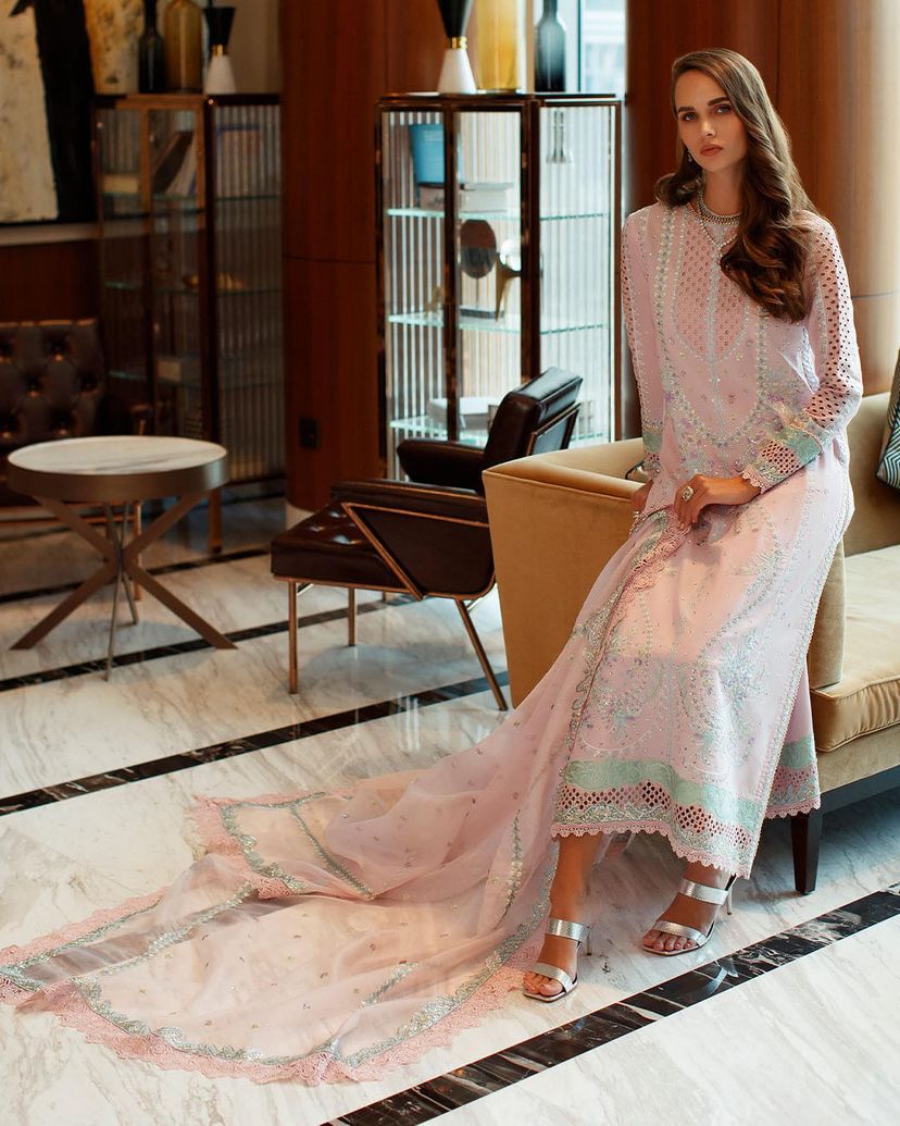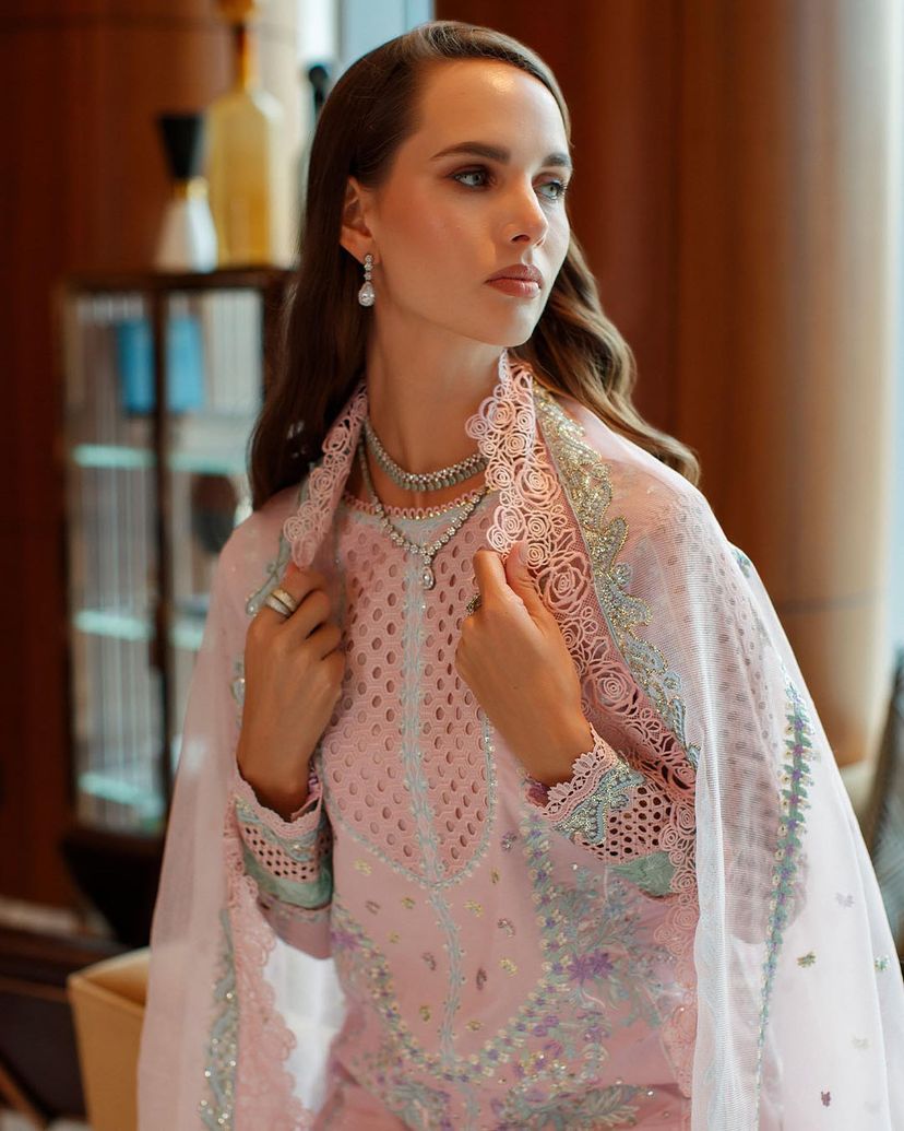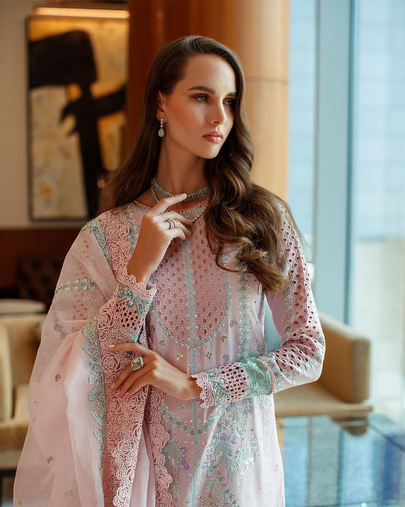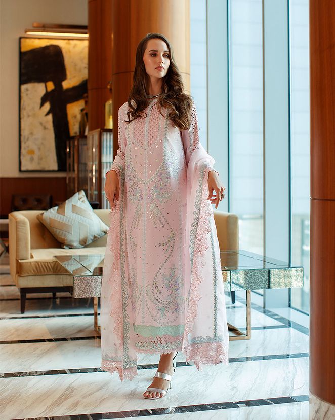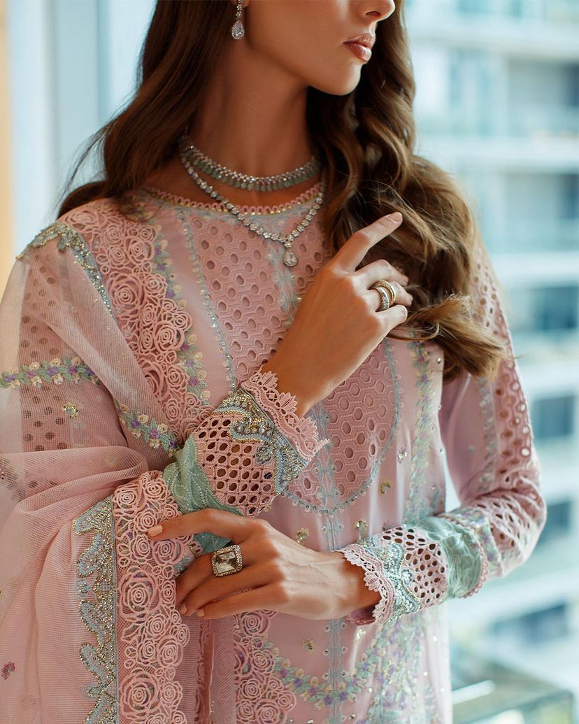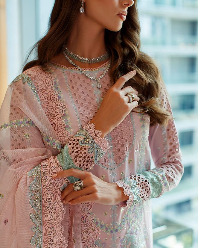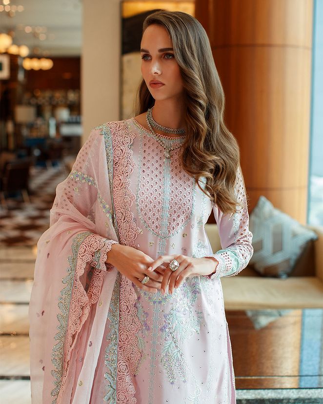 Indulge in the grandeur of our baby pink ensemble, “Evelyn”, where silver embellishments and embroidery lend a touch of opulence. The intricate arm and neck borders add a touch of sophistication that is unmatched.