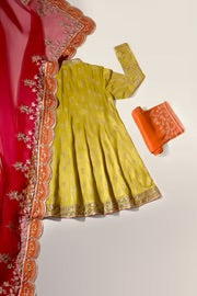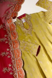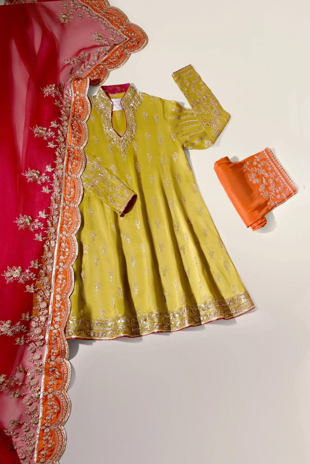 An alluring three piece on pure raw silk in an ethereal shade of dhani green, heavily embellished with zari and ada work of dabka, sequins, naqshi and crystals, in a panelled short kalidaar silhoutte making this beautiful design a must have this festive season. Paired with a contrasting pure organza dupatta and a pure raw silk burnt orange shalwar as seen. The length of the short kalidaar is 34 inches.
