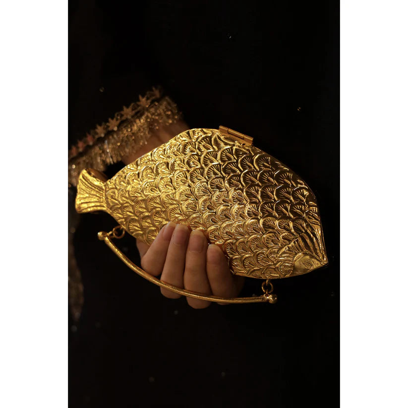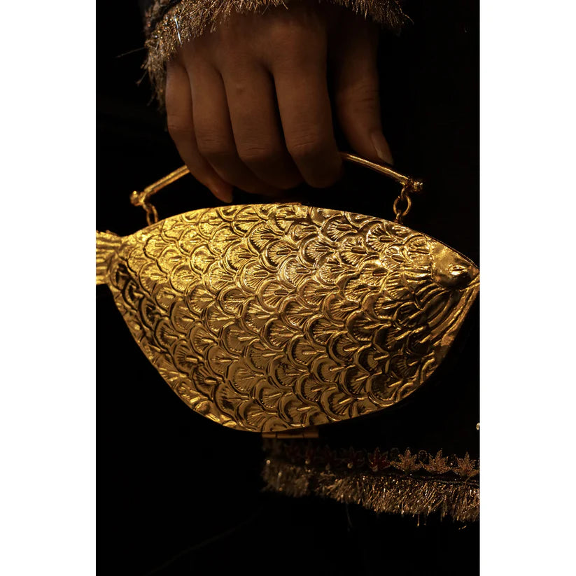 Handmade metel clutch intricately chased scales pattern on surface. Bag can hold some card/cash or a small lipstick concealer etc.