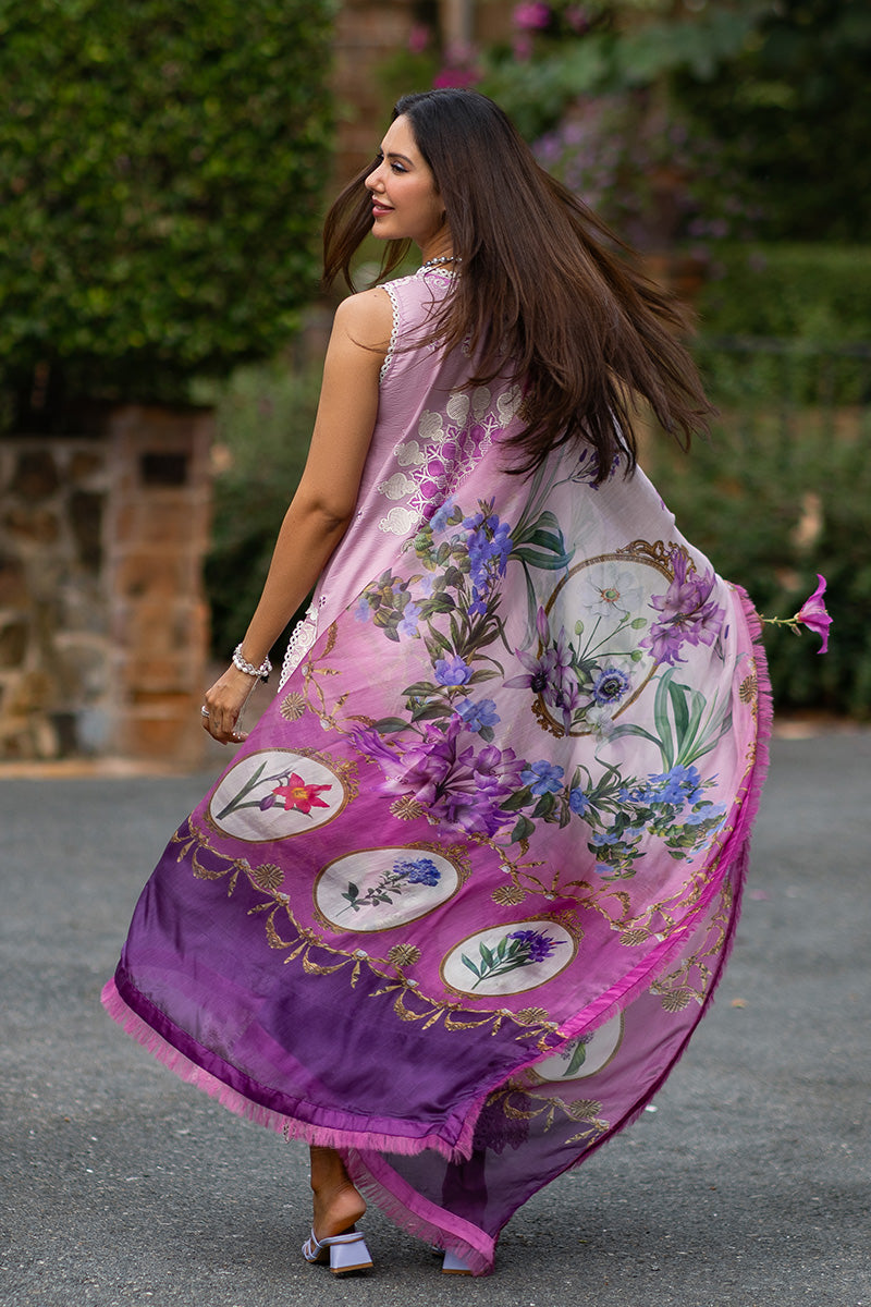 Florence Finesse, a celebration of elegance and sophistication, draped in a delicate pink hue. This enchanting ensemble features a chikan embroidered front and appliqued back, which showcases exquisite detailing and adds a layer of depth to the ensemble. It comes with a pure silk dupatta featuring a digital print design, adding a modern twist to the traditional aesthetic.