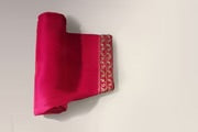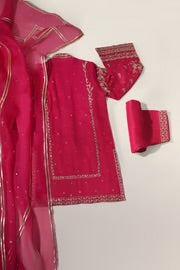 A gorgeous fuchsia pink pure raw silk three piece with an elaborate hand/Ada work neckline , it is the perfect “ stand out from the crowd “. The short length kameez has been adorned with zari and handwork details of dabka sequins moti and naqshi. This alluring design is completed with a shalwar. The length of the Kameez is 34 inches.