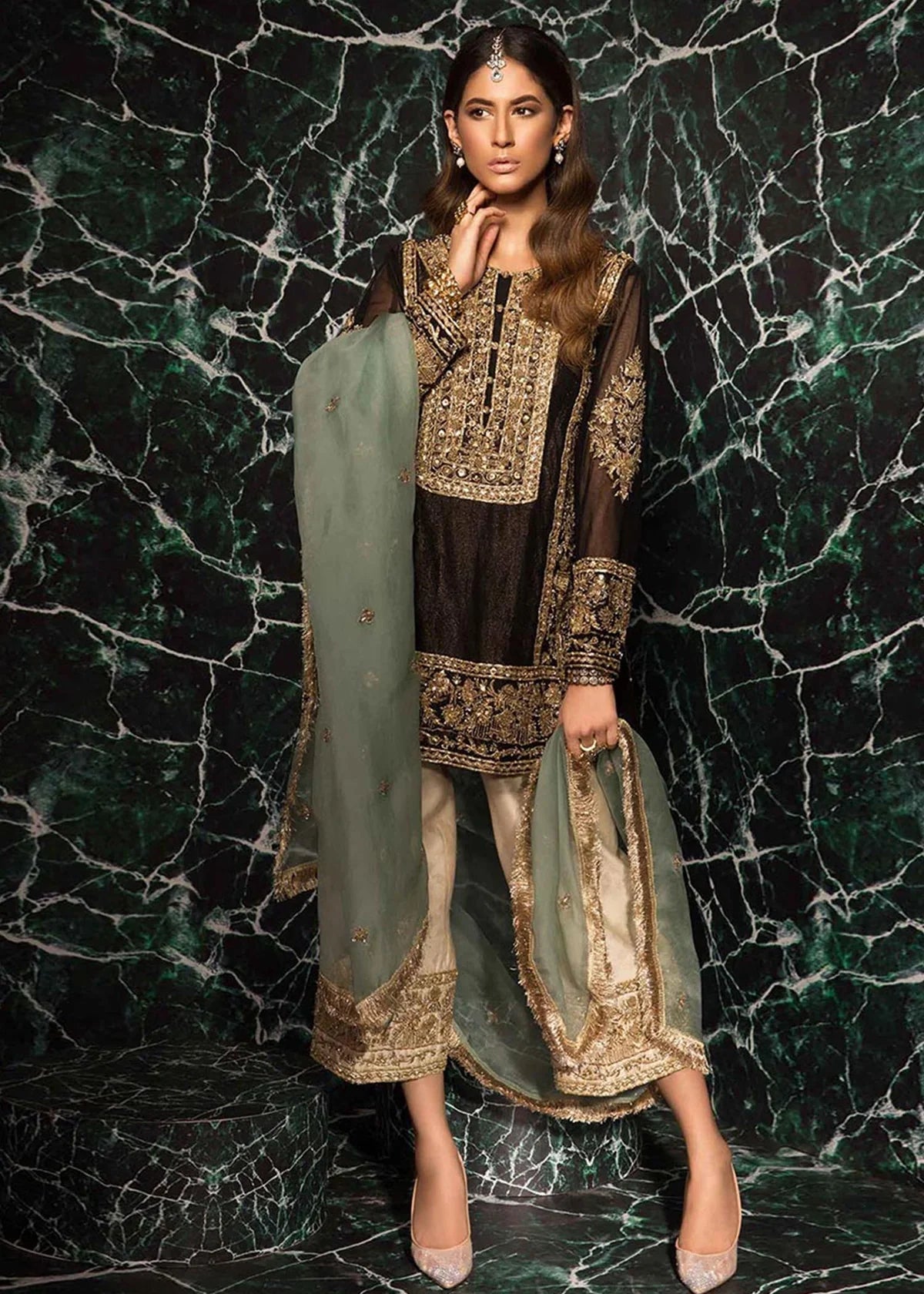 Fabric: NetWhen designing for the modern woman, we prioritize ease of movement and flow. This outfit exhibits fluidity without overpowering the woman wearing it. The cut, silhouette and the meticulously handcrafted embellishments empower the wearer to command attention with every step she takes. This ensemble is entirely hand-worked with naqshi, gotta, bethki, dabka, Kundan, pearls and Zardozi.