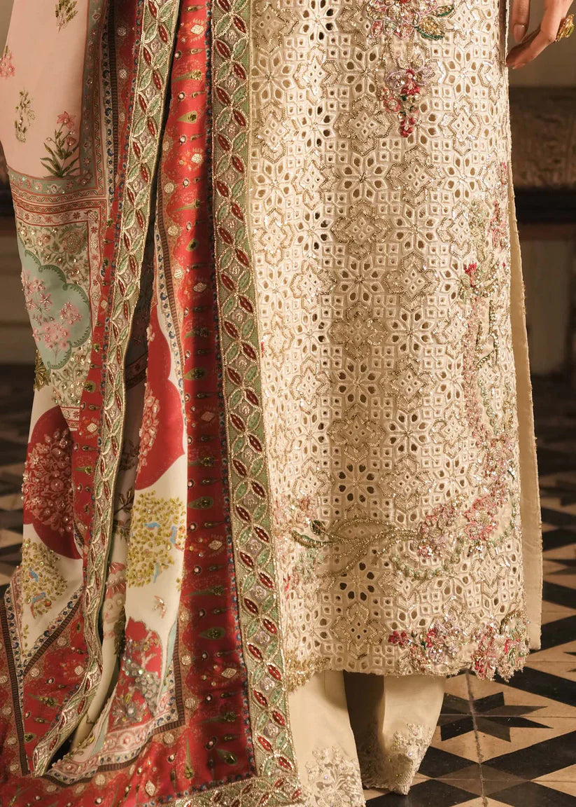 A spellbinding ivory ensemble that exudes the essence of starlit elegance. This ethereal creation captures the allure of stardust, with delicate cutwork embellished in shimmering gold sequins across a silk canvas like star shimmering in the sky. Designed in a graceful, flowing kaftaan silhouette, it is impeccably structured for a flawless fit, enhanced by asymmetrical floral motifs embellished with fine crystals, cutdana and Pearl. The silk shawl is inspired by beautiful miniature Mughal paintings each motif, every border hand picked and embellished in fine detail. A true masterpiece of