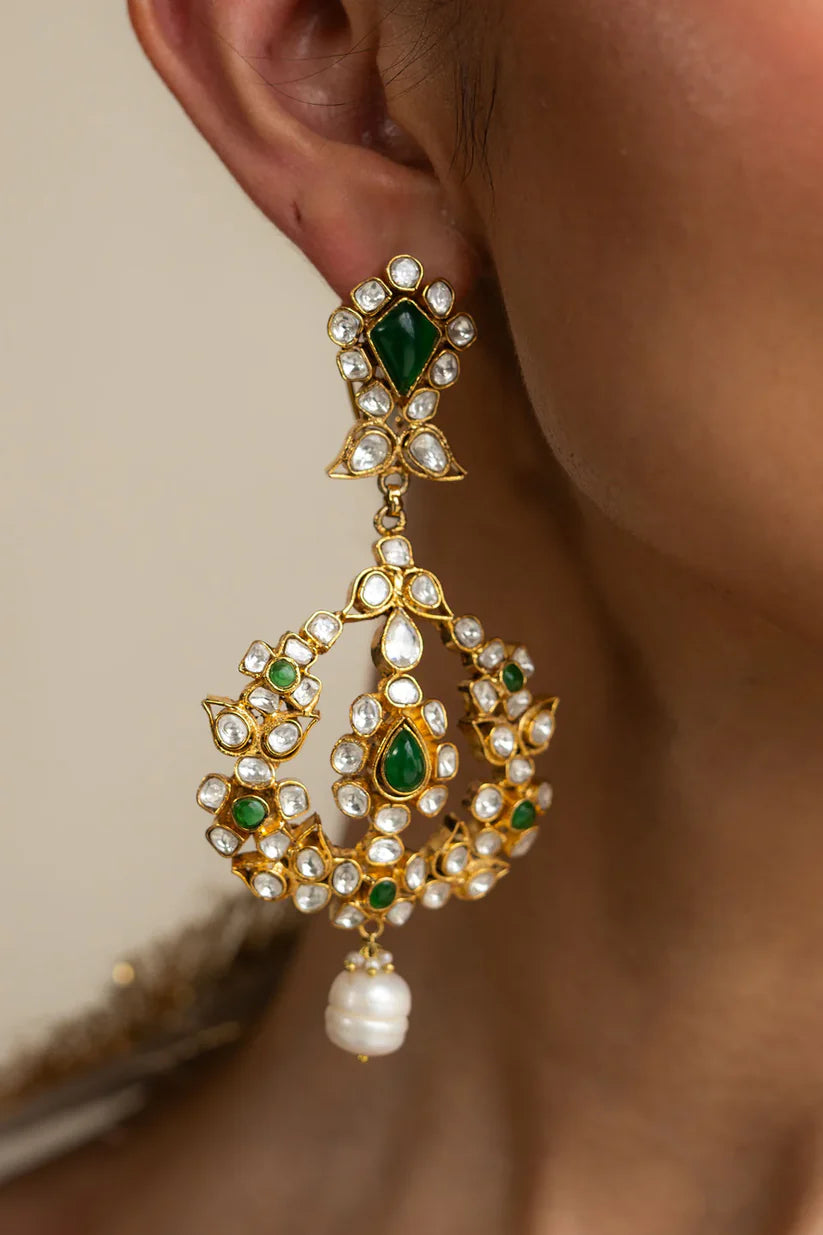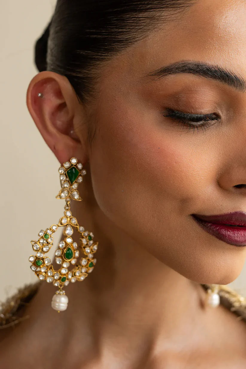 These earrings are adorned with intricate kundan zircon, vibrant colored stones, and lustrous baroque pearls.A perfect fusion of classic craftsmanship and bold elegance, designed to make a statement.