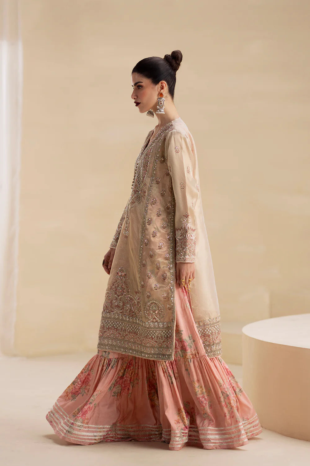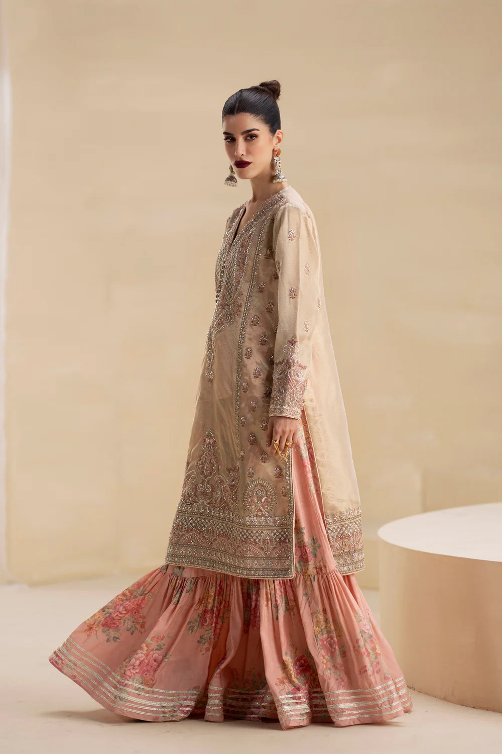 Capture a look of unforgettable, regal glamour with this exquisite embroidered suit, which includes a long shirt, gharara, and slip. The full-length shirt is crafted from a soft beige fabric and is meticulously embellished with heavy gold, pink, and silver thread embroidery. The intricate embroidery, featuring complex floral and traditional motifs, runs densely across the yoke, sleeves, and extended hem, adding luxurious weight and shimmer. Layered beneath is a breathtaking gharara, featuring a voluminous tier in a soft pink hue with a delicate floral print. The combination of the heavily worked shirt and the flowing printed gharara creates a truly majestic silhouette. This stunning ensemble is the epitome of festive luxury.