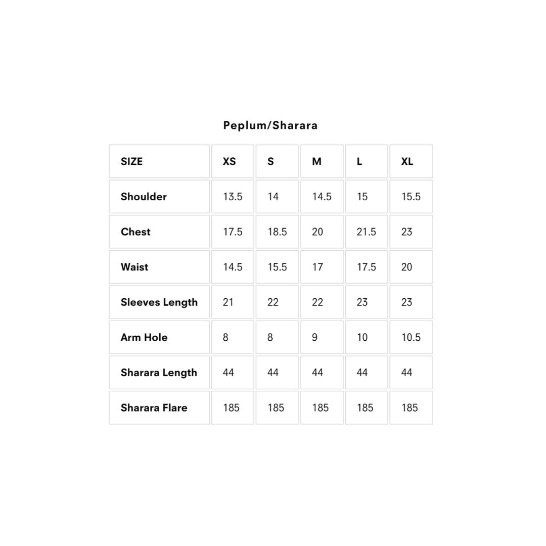 Envelop yourself in the luminosity of this graceful peplum flair shirt, adorned with exquisite sequins, tilla, and silken thread intricacies on a soft organza canvas. Elevated with cutdana, pearl, and baithki embellishments, it exudes a dazzling touch of opulence and luxury. The shirt is enhanced with a sharara that features cutwork and a stunning organza dupatta that breathes life into this ethereal outfit.