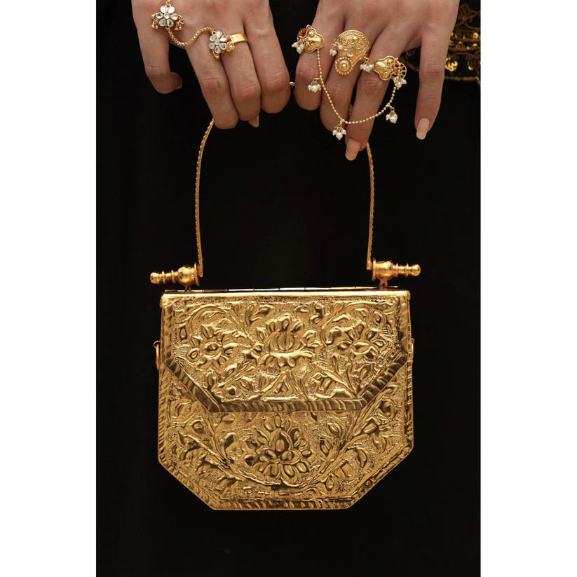 Handmade metel clutch intricately chased flower pattern on surface. Bag can hold some card/cash or a small lipstick concealer etc.
