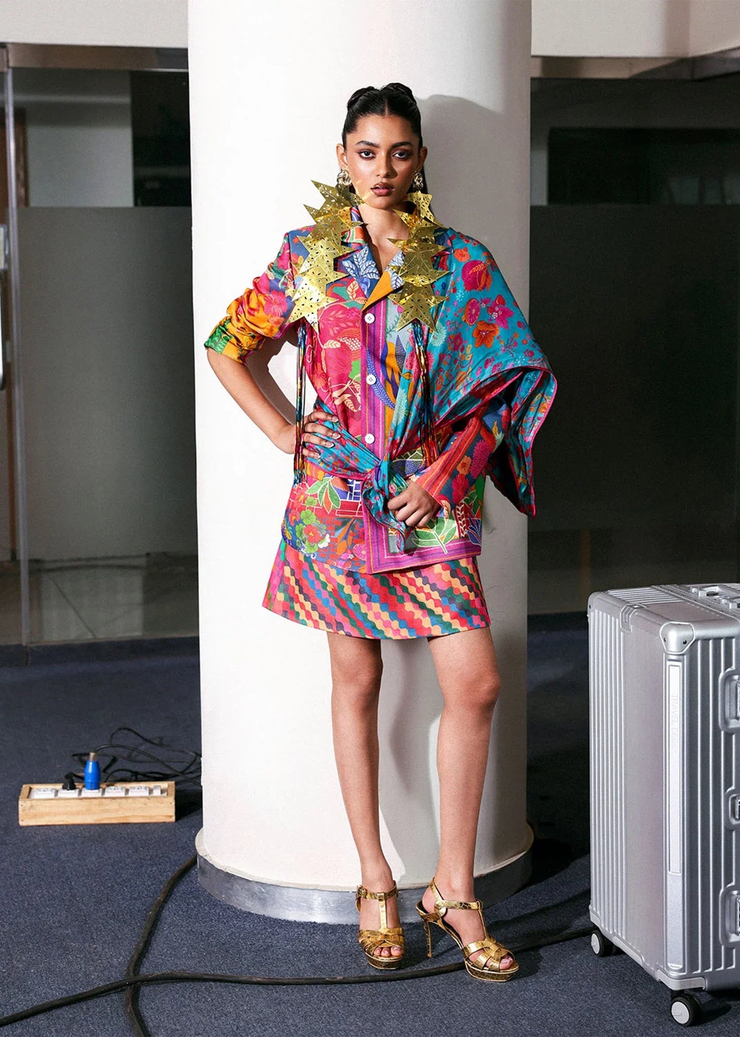 A bold, collage-style printed silk jacket featuring a tailored silhouette with sharp lapels, structured shoulders, and vibrant multicolored panels. Crafted in textured silk with button-down detailing, the piece merges graphic florals, checkered waves, and geometric motifs. It is paired up with a multicolored mini skirt for a playful look.
