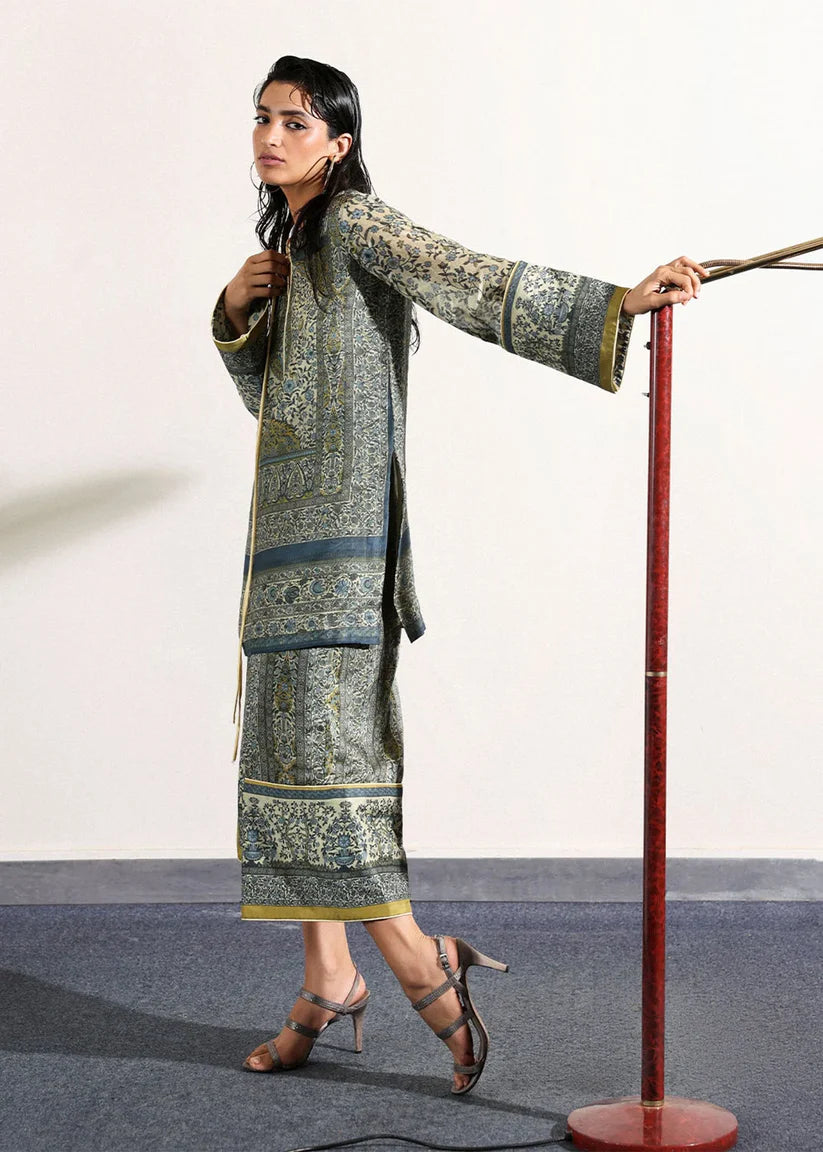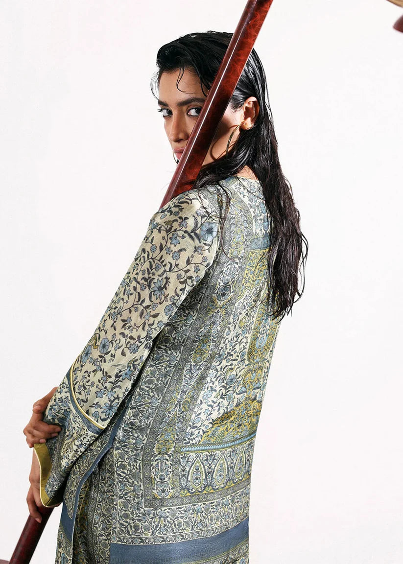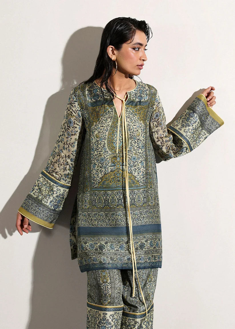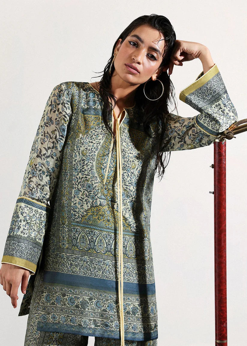 A blue and green floral printed silk set adorned with butter yellow satin silk trims and tassel details. Paired with matching printed culottes for a breezy, elegant look.