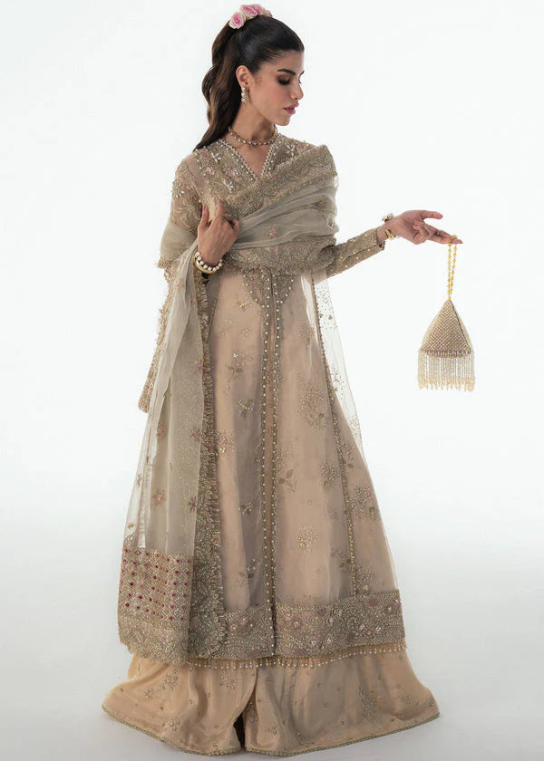 Purity and perfection come together in this floral based design that features a digitally printed organza gown with 3d crafting used to lift the base pattern . Offset with heavily crafted sleeves ,a gorgeous neckline and border all detailed with hand embellishments design whispers everything soft , feminine and romantic . Paired with a detailed dupatta and a soft silk sparkling lehnga.