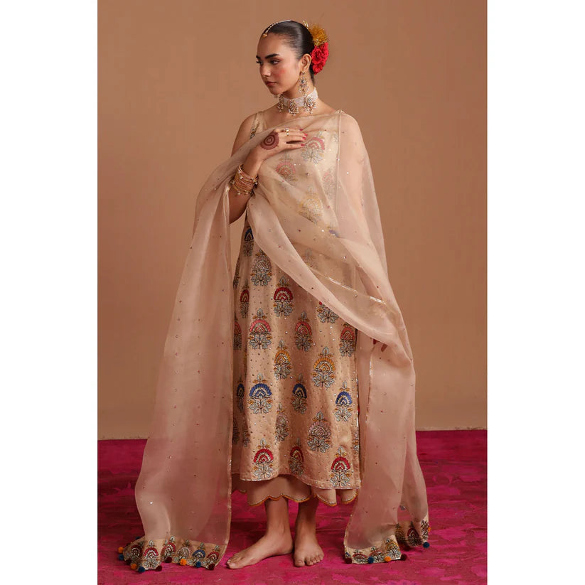 Ivory Shamooz Silk long shirt with badla, tilla and resham embroidery enhanced with adda work paired with culottes and an organza dupatta.
