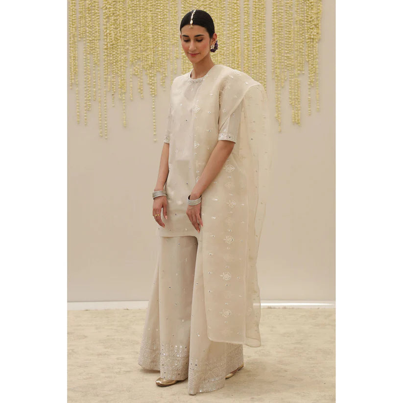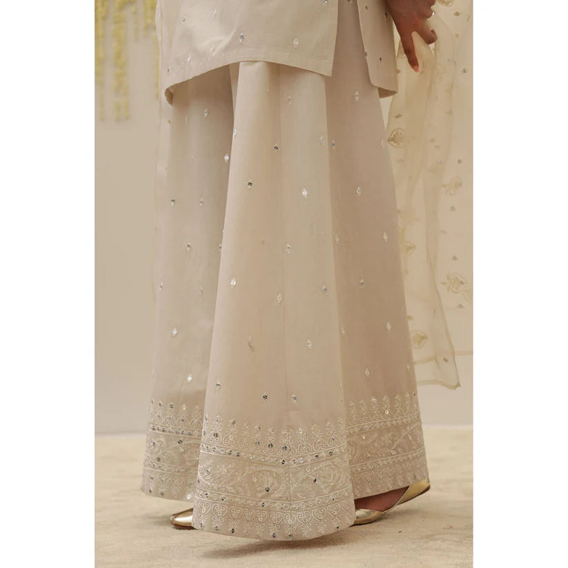 Ivory self-colored mirror like embroidered cotton shirt paired with loose hem trouser and an organza dupatta.