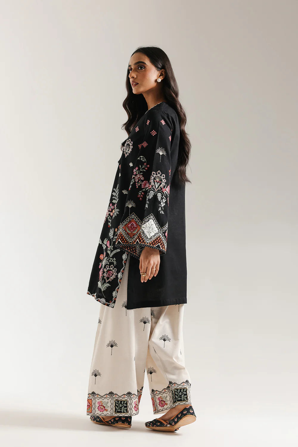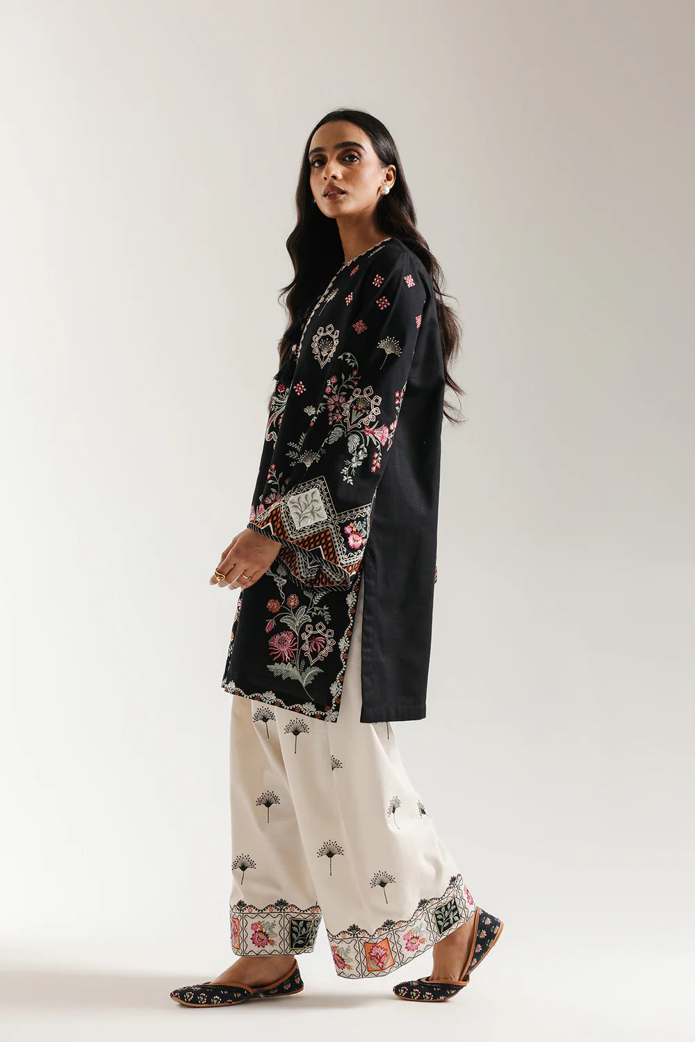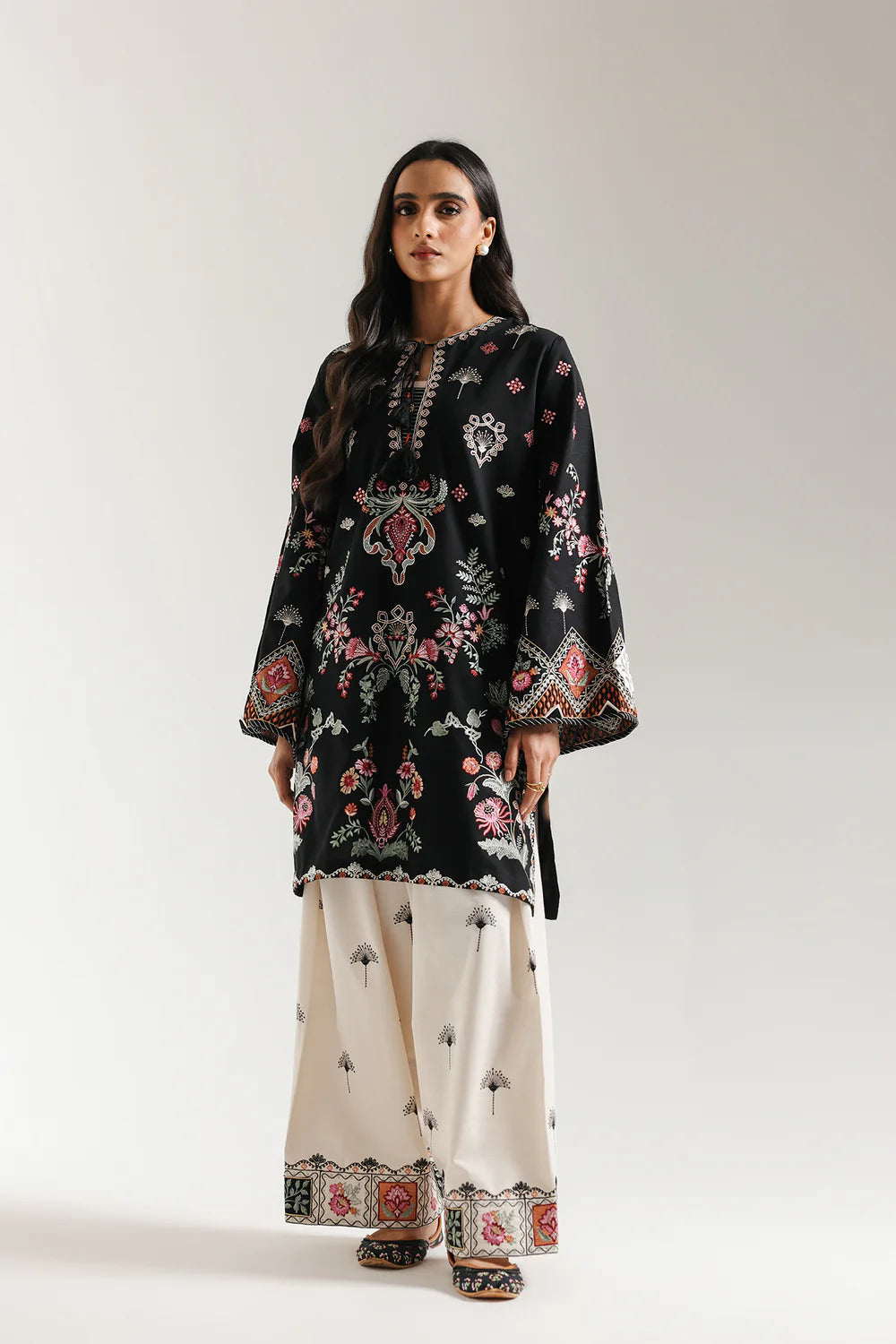 Exude vibrant sophistication in the rich contrast of this stunning embroidered suit. This striking ensemble features a short-length kurti and wide-leg shalwar in a deep solid black fabric. The shirt is dramatically embellished with intricate floral embroidery in beautiful pink, peach, and green hues, creating an ornate central panel and a heavy border around the hemline. It features a round neckline with a slit and a short placket accented by decorative buttons. The trousers offer a beautiful contrast, crafted from a pale beige fabric with scattered black floral embroidery, finished with a heavy, colorful embroidered border at the cuffs. This suit is a celebration of luxurious texture and bold, beautifully applied color.