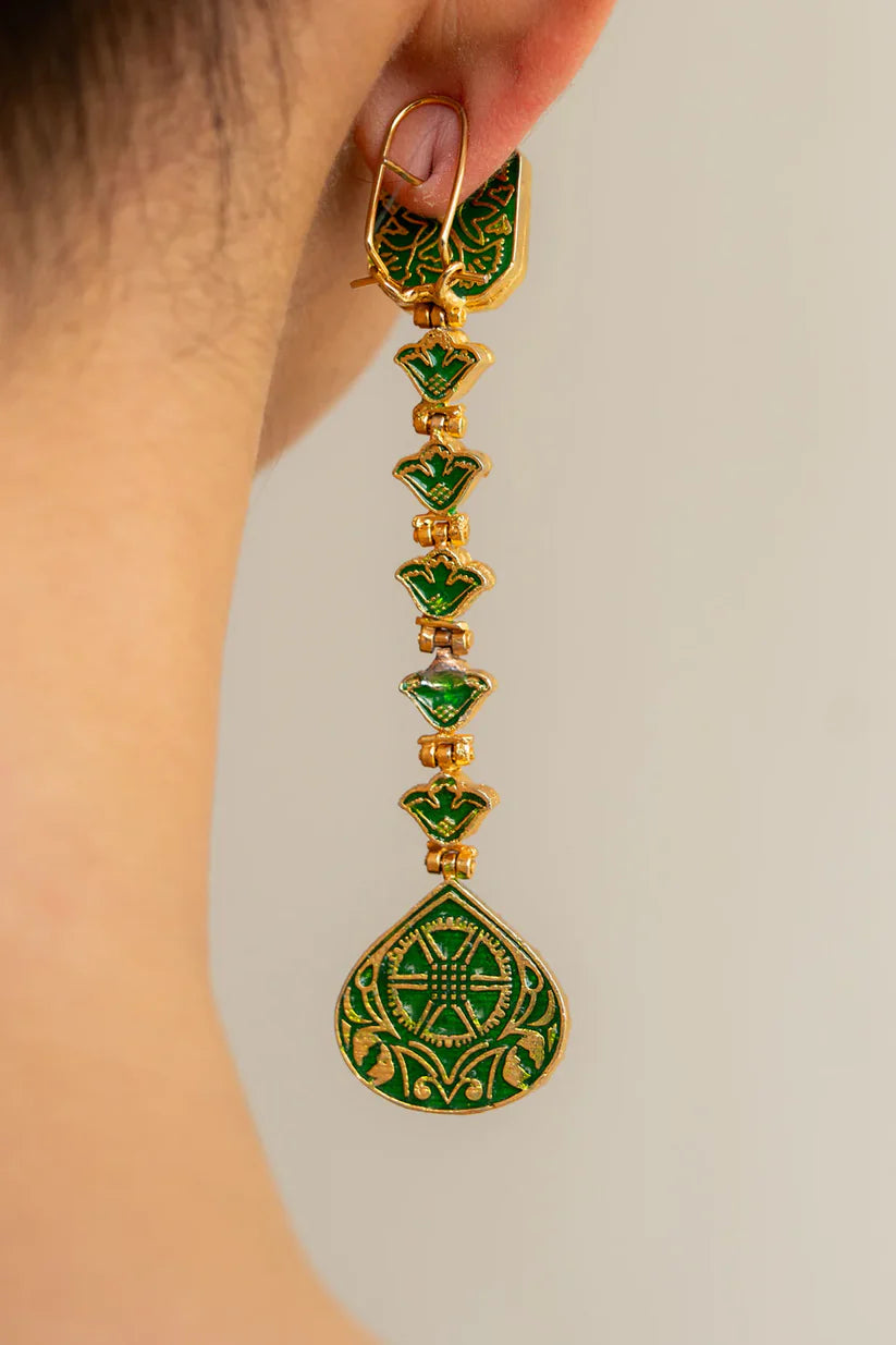 These 22K gold-plated earrings feature a striking combination of square and drop-shaped carved jade stones, set with zircon kundan.The intricately designed back, adorned with patterns and green meena, creates a perfect blend of modern artistry and traditional elegance.