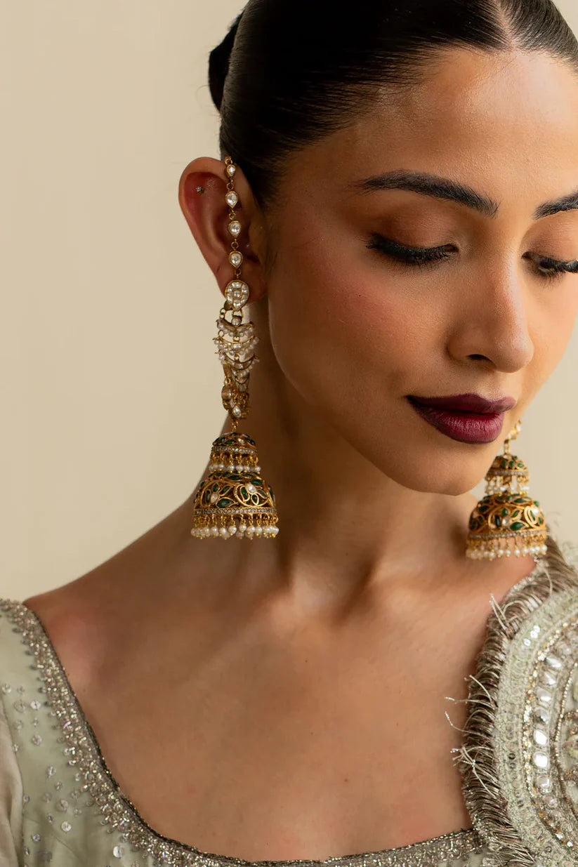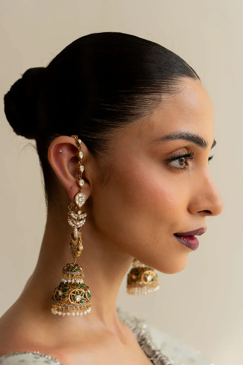 These 22K gold-plated earrings are a true head-turner for any occasion, beautifully set with zircon kundan, green stones, and real gemstones.A perfect fusion of tradition and modern elegance, designed to captivate.